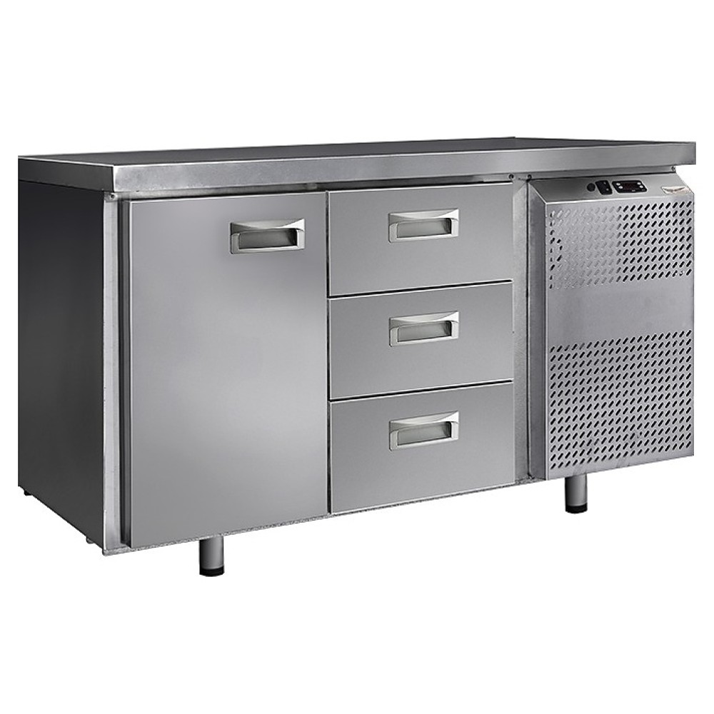 Морозильный стол Finist НХС-600-1/3 предназначен для хранения предварительно замороженных пищевых продуктов на предприятиях общественного питания и торговли. Модель оснащена расположенным сбоку агрегатным отсеком, столешницей с задним бортом, холодильной камерой с распашной дверцей, 3 выдвижными ящиками, устойчивыми ножками с подпятниками, кабелем питания с евровилкой и кнопочной панелью управления с цифровым дисплеем. Цельнозаливной корпус выполнен из высококачественной нержавеющей стали.