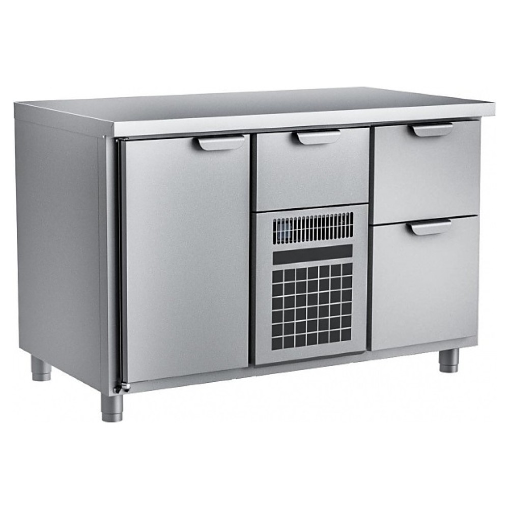 Морозильный стол HappyChef TF BD 1-FBR-2 предназначен для хранения предварительно замороженных пищевых продуктов и обработки ингредиентов в процессе приготовления блюд на предприятиях общественного питания и торговли. Модель оснащена секцией с компрессорным холодильным агрегатом со съемной холодильной кассетой (Россия) с нижним центральным расположением и верхним выдвижным ящиком, секцией с глухой распашной дверью слева и секцией с 2 выдвижными ящиками справа, усиленной столешницей без борта и электронной панелью управления, дверь и ящики имеют короткие горизонтальные рукоятки в верхней части. Корпус выполнен из нержавеющей стали марки AISI 430, столешница – из нержавеющей стали марки AISI 304.
