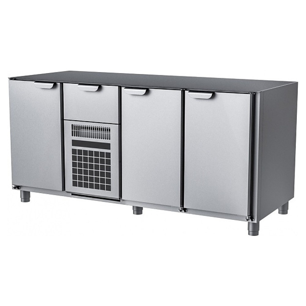 Морозильный стол HappyChef TF G 1-FBR-1-1 предназначен для хранения предварительно замороженных пищевых продуктов на предприятиях общественного питания и торговли. Модель оснащена секцией с компрессорным холодильным агрегатом со съемной холодильной кассетой (Россия) с нижним центральным расположением и верхним выдвижным ящиком, 2 секциями справа и 1 секцией слева с глухой распашной дверью в каждой и электронной панелью управления, двери и ящик имеют короткие горизонтальные рукоятки в верхней части. Корпус выполнен из нержавеющей стали марки AISI 430.