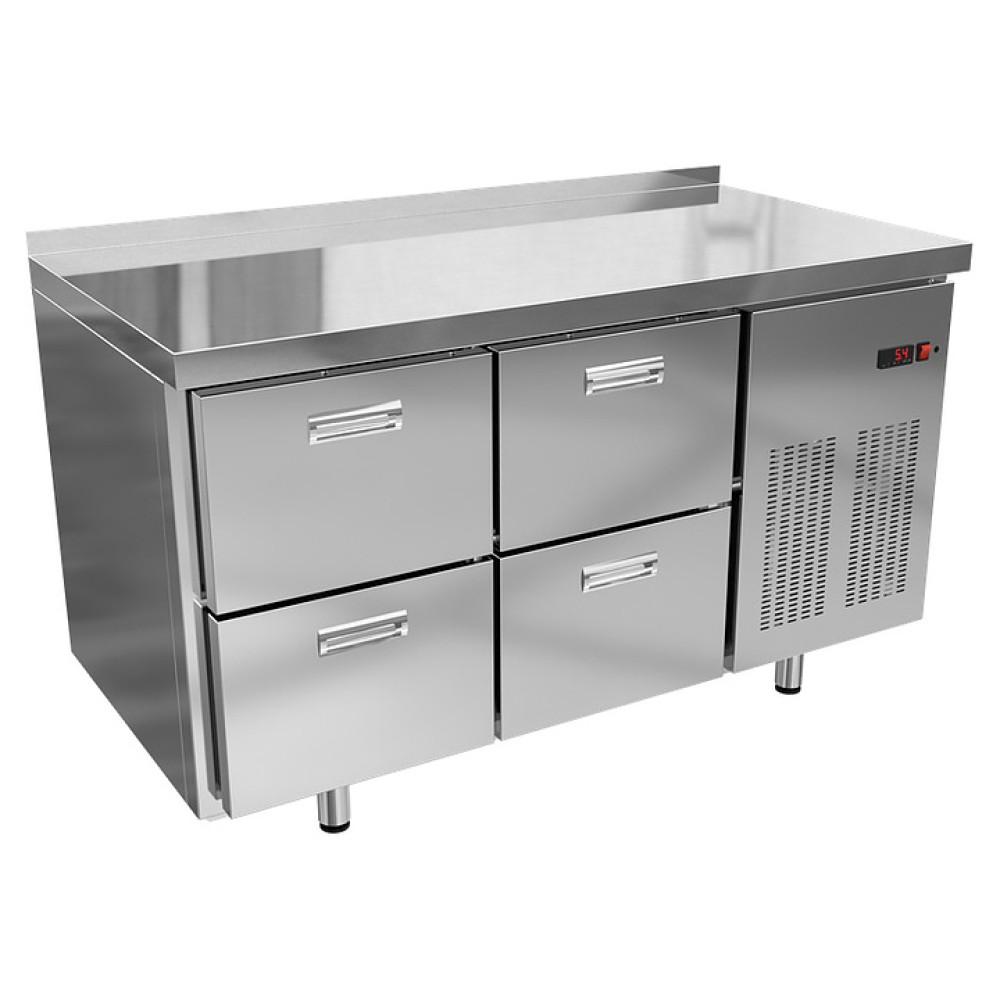 Морозильный стол KRONER СМб 4я-140-70 предназначен для хранения предварительно замороженных пищевых продуктов и обработки ингредиентов в процессе приготовления блюд. Модель оснащена встроенным компрессорным холодильным агрегатом с боковым расположением, столешницей c задним бортом, электронной панелью управления и морозильной камерой с 2 секциями: в каждой секции по 2 выдвижных ящика. Корпус и столешница выполнены из шлифованной нержавеющей стали, задняя стенка – из оцинкованной стали.