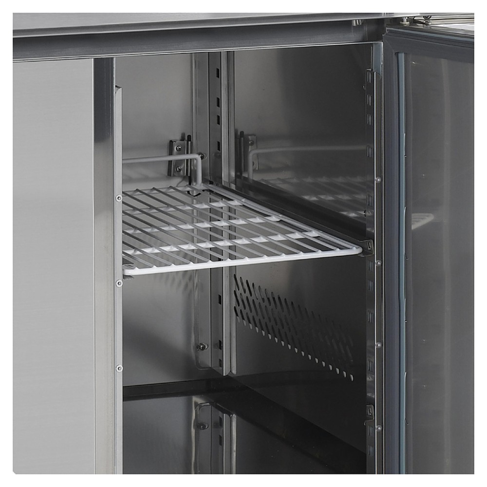 Конструкция стола включает в себя стальную столешницу, холодильную камеру с двухсекционным холодильным отсеком для размещения контейнеров формата GN. Задний край столешницы оборудован бортом для комфортного размещения у стены и предотвращения её загрязнения.