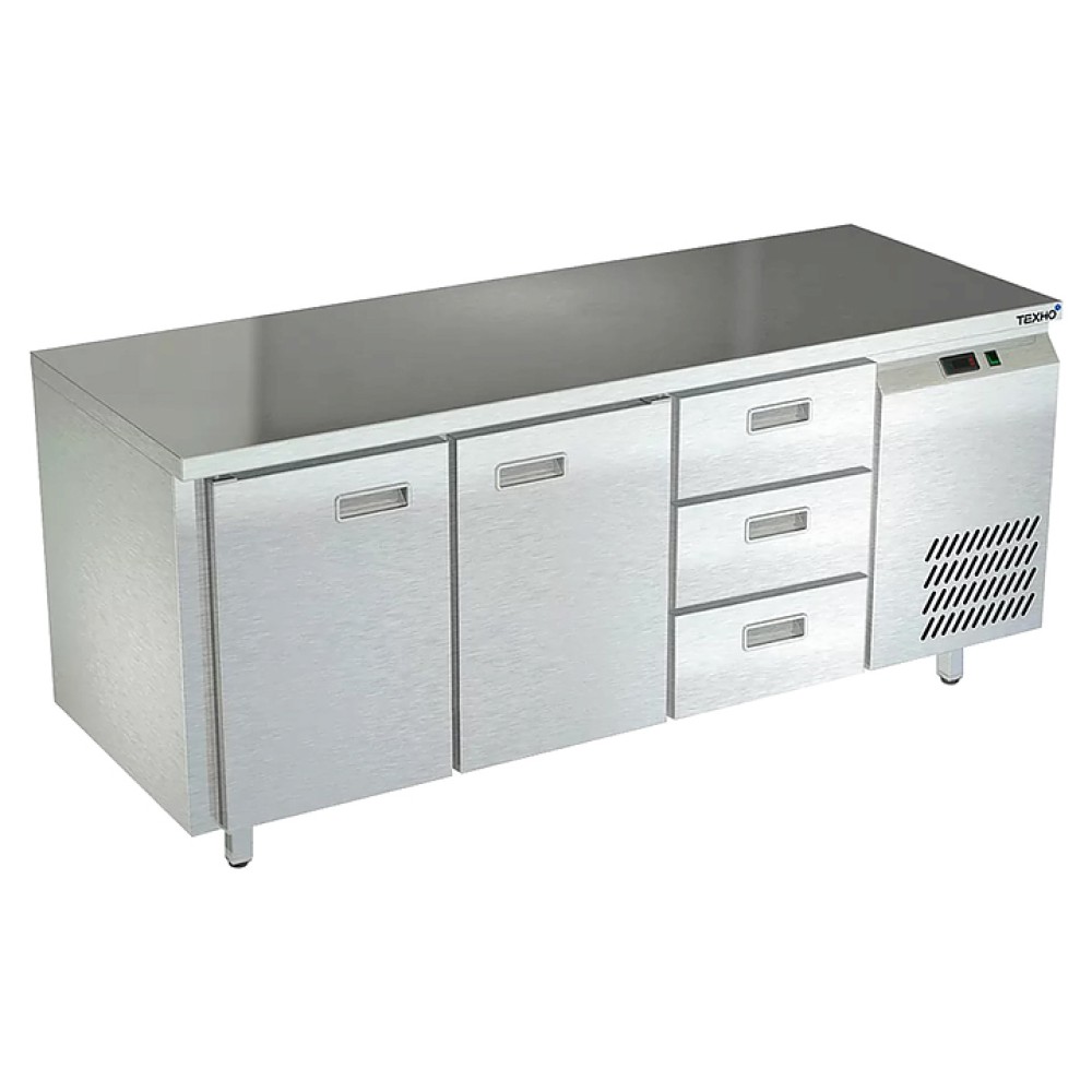 Морозильный стол Техно-ТТ СПБ/М-122/23-1807 предназначен для раскатки теста, обработки, заморозки и долговременного хранения продуктов, полуфабрикатов, напитков и мороженого на предприятиях общественного питания и торговли. Модель оснащена 2 секциями с 2 дверьми и регулируемой полкой-решеткой, 1 секцией с 3 ящиками, направляющими с доводчиками (Австрия), петлями-доводчиками (Польша) и круглыми ножками, регулируемыми по высоте на 50 мм (Италия). Корпус и столешница выполнены из нержавеющей стали AISI 430, задняя стенка и дно - из оцинкованной стали.