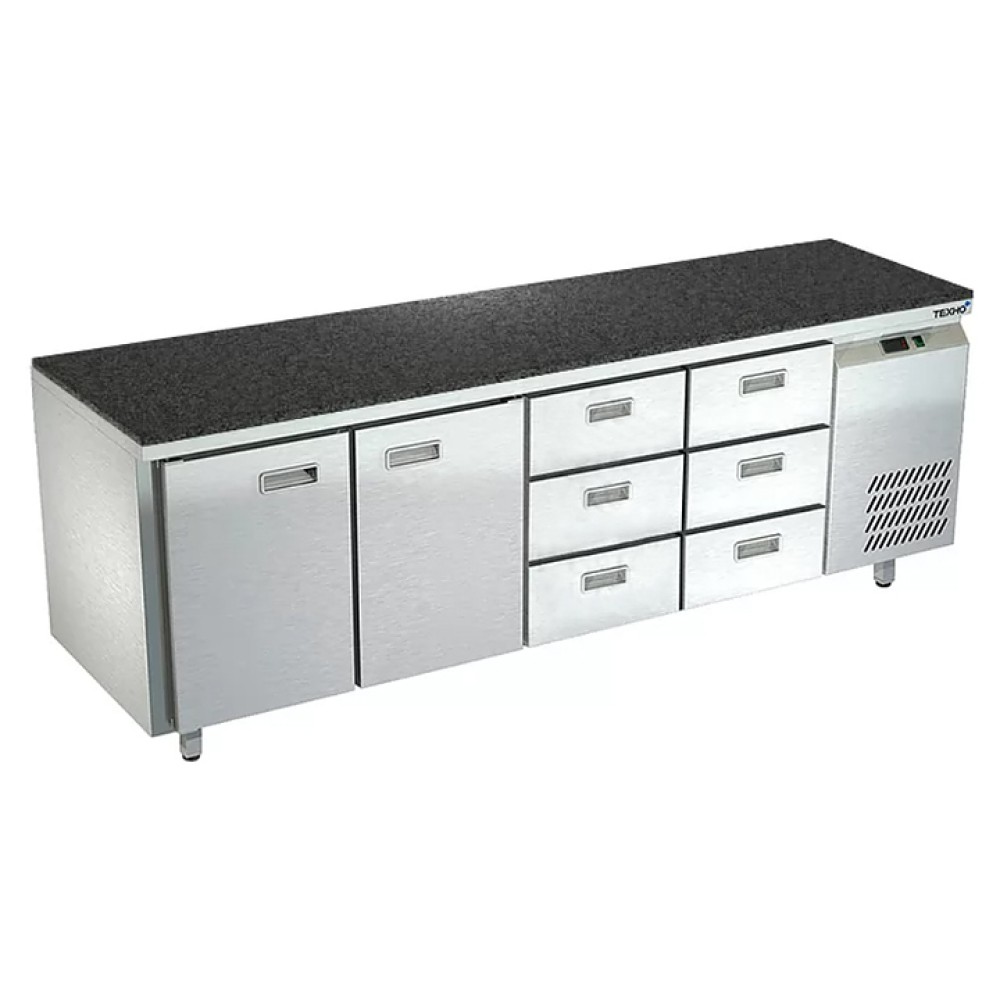 Морозильный стол Техно-ТТ СПБ/М-322/26-2207 предназначен для раскатки теста, обработки, заморозки и долговременного хранения продуктов, полуфабрикатов, напитков и мороженого на предприятиях общественного питания и торговли. Модель оснащена 2 секциями с 2 дверьми и регулируемой полкой-решеткой, 2 секциями с 6 ящиками, направляющими с доводчиками (Австрия), петлями-доводчиками (Польша) и круглыми ножками, регулируемыми по высоте на 50 мм (Италия). Корпус выполнен из нержавеющей стали AISI 430, задняя стенка и дно - из оцинкованной стали, столешница - из камня.