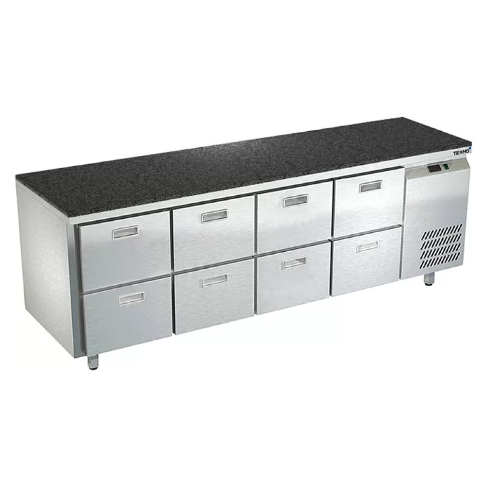 Морозильный стол Техно-ТТ СПБ/М-322/13-2207 предназначен для раскатки теста, обработки, заморозки и долговременного хранения продуктов, полуфабрикатов, напитков и мороженого на предприятиях общественного питания и торговли. Модель оснащена 4 секциями с 8 ящиками, направляющими с доводчиками (Австрия) и круглыми ножками, регулируемыми по высоте на 50 мм (Италия). Корпус выполнен из нержавеющей стали AISI 430, задняя стенка и дно - из оцинкованной стали, столешница - из камня.