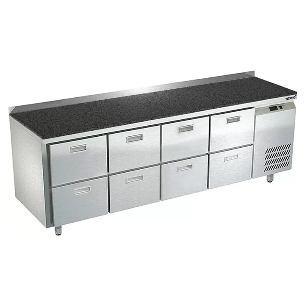 Морозильный стол Техно-ТТ СПБ/М-423/08-2207 предназначен для раскатки теста, обработки, заморозки и долговременного хранения продуктов, полуфабрикатов, напитков и мороженого на предприятиях общественного питания и торговли. Модель оснащена 4 секциями с 8 ящиками, направляющими с доводчиками (Австрия), бортом и круглыми ножками, регулируемыми по высоте на 50 мм (Италия). Корпус выполнен из нержавеющей стали AISI 430, задняя стенка и дно - из оцинкованной стали.