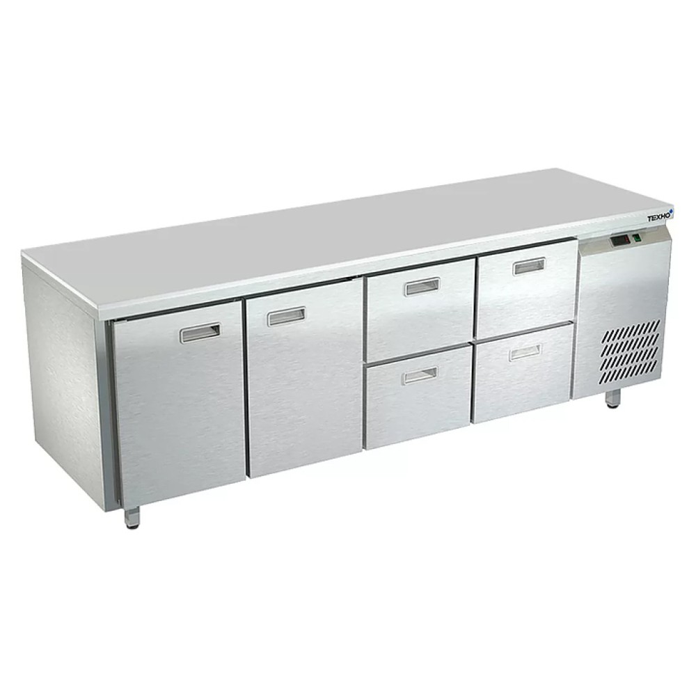 Морозильный стол Техно-ТТ СПБ/М-522/24-2207 предназначен для раскатки теста, обработки, заморозки и долговременного хранения продуктов, полуфабрикатов, напитков и мороженого на предприятиях общественного питания и торговли. Модель оснащена 2 секциями с 2 дверьми и регулируемой полкой-решеткой, 2 секциями с 4 ящиками, направляющими с доводчиками (Австрия), петлями-доводчиками (Польша) и круглыми ножками, регулируемыми по высоте на 50 мм (Италия). Корпус выполнен из нержавеющей стали AISI 430, задняя стенка и дно - из оцинкованной стали, столешница - из полипропилена.