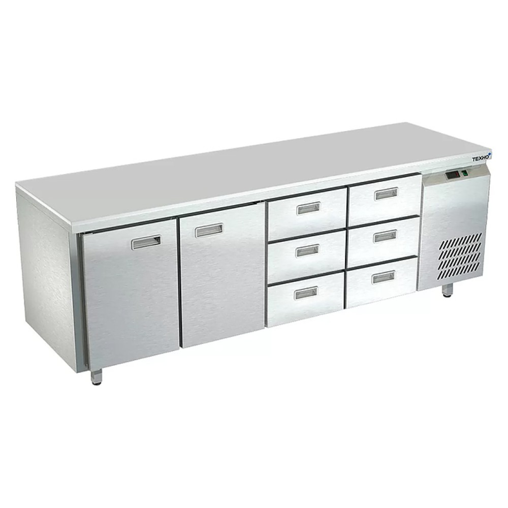Морозильный стол Техно-ТТ СПБ/М-522/26-2207 предназначен для раскатки теста, обработки, заморозки и долговременного хранения продуктов, полуфабрикатов, напитков и мороженого на предприятиях общественного питания и торговли. Модель оснащена 2 секциями с 2 дверьми и регулируемой полкой-решеткой, 2 секциями с 6 ящиками, направляющими с доводчиками (Австрия), петлями-доводчиками (Польша) и круглыми ножками, регулируемыми по высоте на 50 мм (Италия). Корпус выполнен из нержавеющей стали AISI 430, задняя стенка и дно - из оцинкованной стали, столешница - из полипропилена.