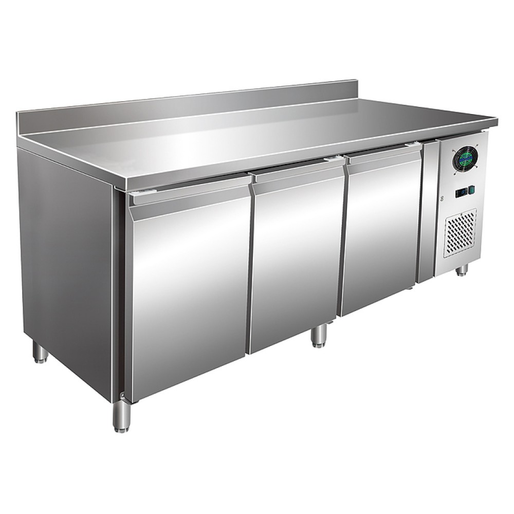 Морозильный стол VIATTO GN3200BT предназначен для обработки, охлаждения, заморозки и длительного хранения пищевых продуктов на предприятиях общественного питания и торговли. Модель оснащена расположенным сбоку агрегатным отсеком, электронным термостатом, столешницей, 3 морозильными камерами с распашными дверьми, 3 полками для гастроемкостей, устойчивыми опорами, кабелем питания и панелью управления с цифровым дисплеем. Корпус и столешница выполнены из высококачественной нержавеющей стали.