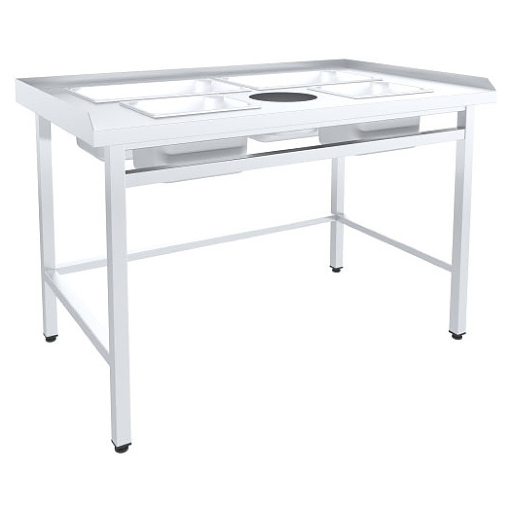Стол Пищевые Технологии СРО-13/8Д предназначен для обработки корнеплодов на предприятиях общественного питания. Модель оснащена бортом, 4 отсеками для гастроемкостей и круглым отверстием для сбора отходов. Разборный каркас выполнен из нержавеющей квадратной трубы с пластиковыми подпятниками, столешница - из нержавеющей стали AISI 430 с усилением из листа ЛДСП.