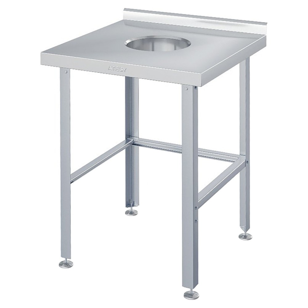 Стол ATESY СРО-С-1-600.600-02-Н серии Стандарт используется на предприятиях общественного питания и торговли для сбора пищевых отходов. Каркас и столешница выполнены из профиля из нержавеющей стали AISI 430 толщиной 0,8 мм, столешница дополнительно укреплена с внутренней стороны листом ламинированной древесно-стружечной плиты.