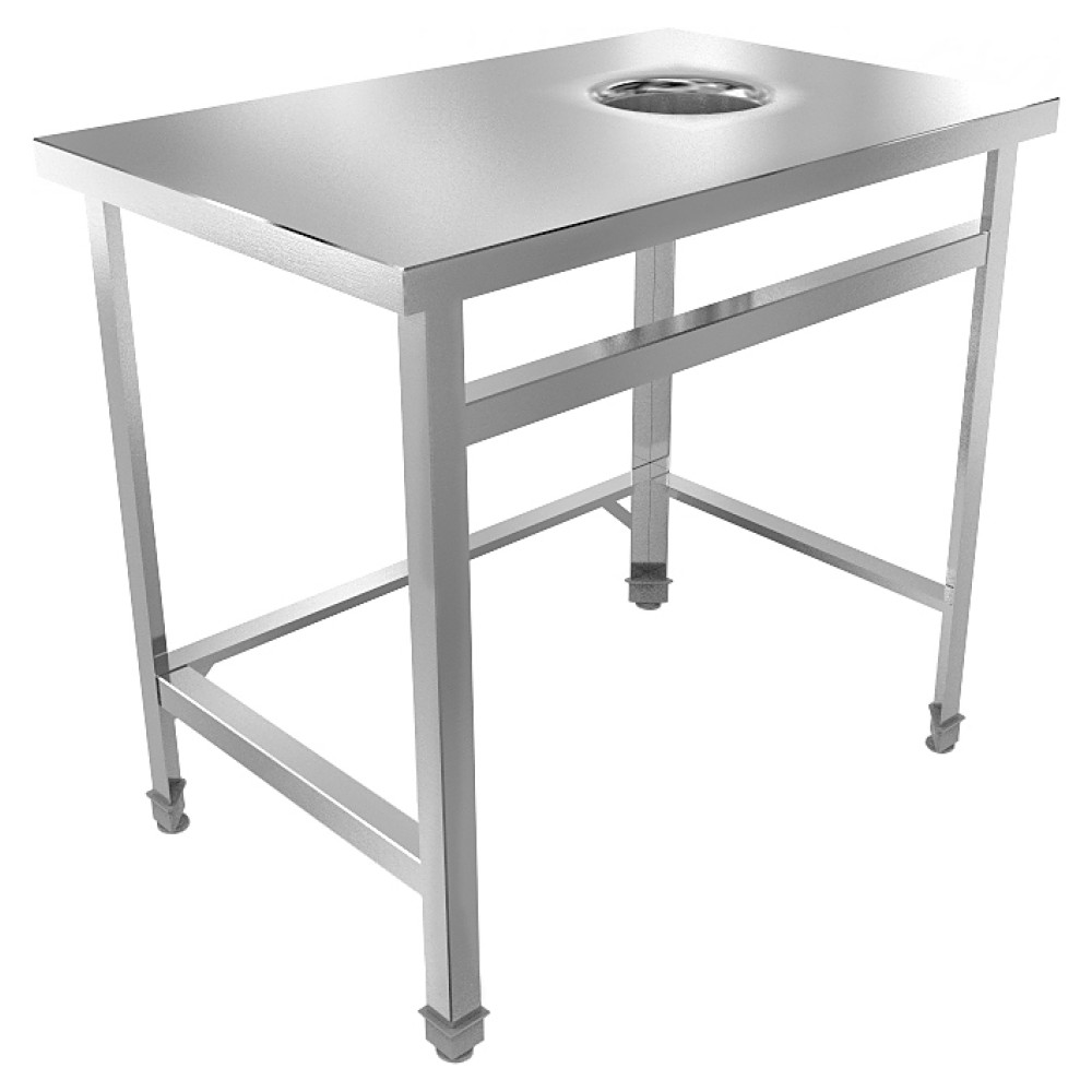 Стол для сбора отходов Техно-ТТ СПС-111/600 используется в цехах на предприятиях общественного питания и торговли. Модель оснащена отверстием для сбора отходов, расположенным в центре, и регулируемыми по высоте ножками, что позволяет компенсировать неровности пола. Разборный каркас выполнен из конструкционного профиля, покрытого порошковой краской, столешница со звукопоглощающими подкладками - из нержавеющей стали AISI 304.