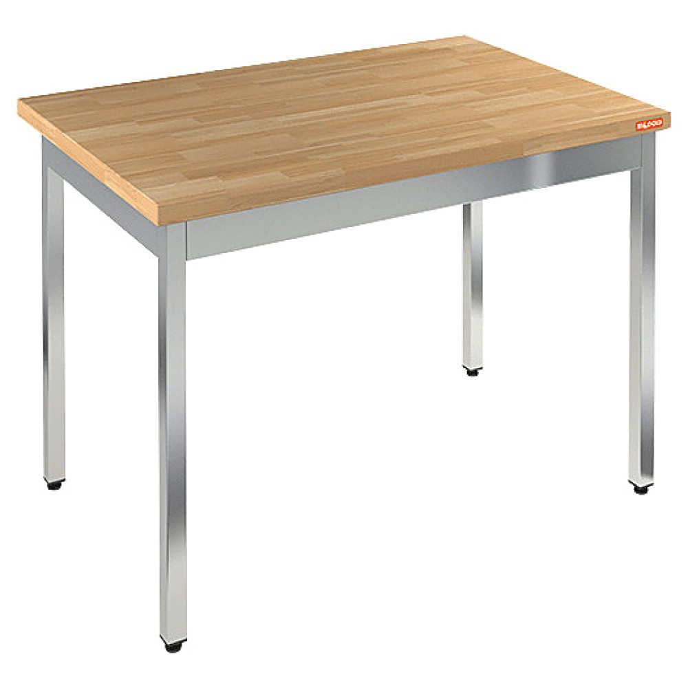 Столешница выполнена из бука, опорные ножки - из трубы 40х40 мм из нержавеющей стали.