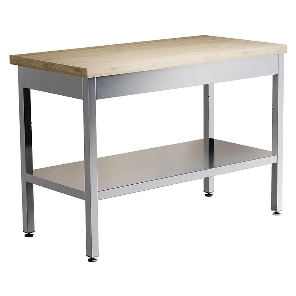 Кондитерский стол Restoinox СПК-12/8-П предназначен для разделки и обработки пищевых продуктов, а также для расстановки и хранения посуды и кухонного инвентаря на предприятиях общественного питания и торговли. Модель оснащена сплошной полкой, усиленной ребром жесткости из нержавеющей стали Aisi 430. Ножки выполнены из квадратной трубы 40х40 мм из нержавеющей стали Aisi 430, полка - из нержавеющей стали Aisi 430, столешница - из бука.