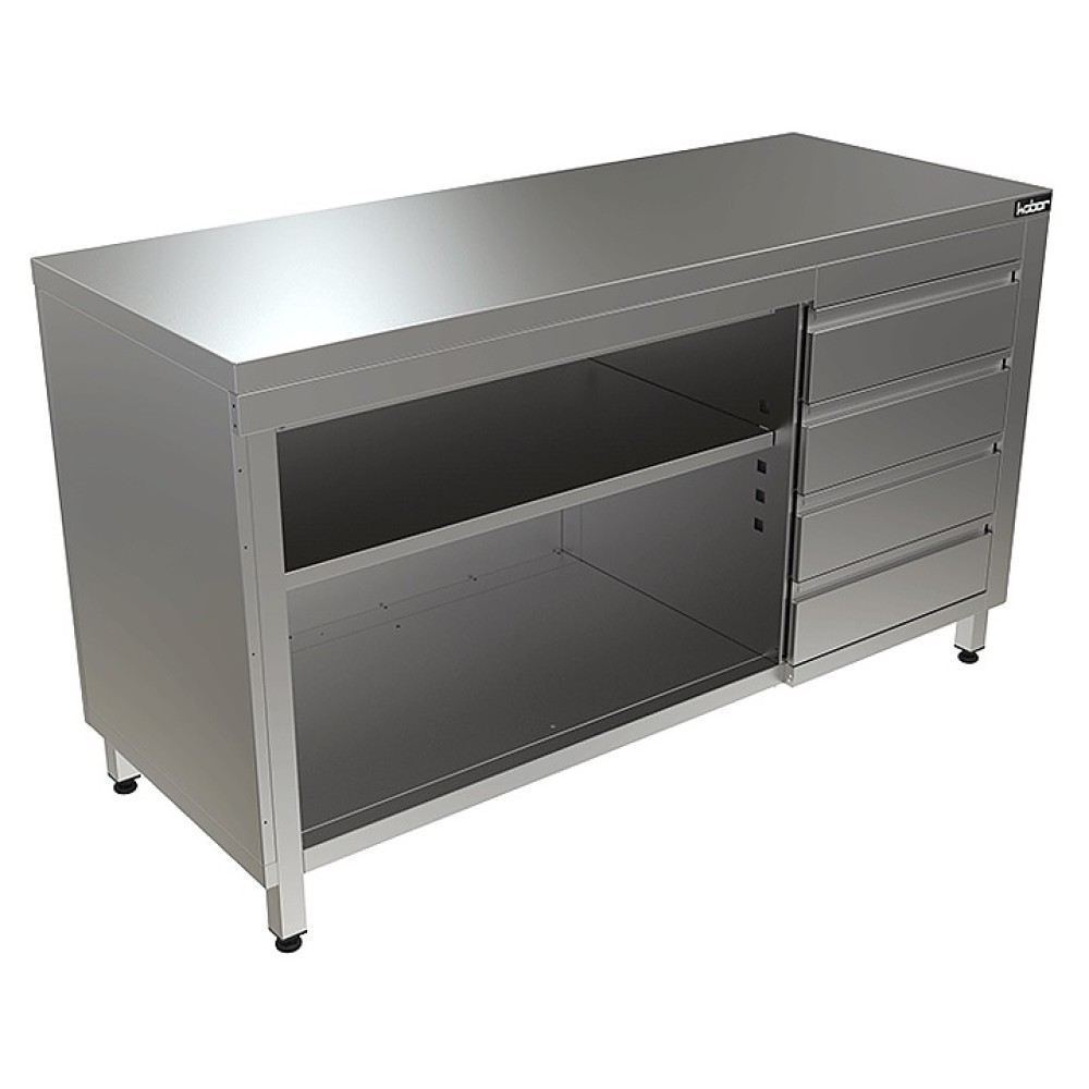 Стол-тумба Кобор СТ/1-150/60/О произведена из высококачественной нержавеющей стали, что позволяет использовать предмет в различных цехах. Во избежание прогибов столешница усилена листом ЛДСП толщиной 16 мм. Ножки изделия регулируются по высоте, для исключения проблем с неровным напольным покрытием, предотвращая наклон рабочей поверности.