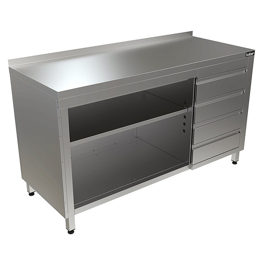 Стол-тумба Кобор СТБ/1-150/60/О произведена из высококачественной нержавеющей стали, что позволяет использовать предмет в различных цехах. Во избежание прогибов столешница усилена листом ЛДСП толщиной 16 мм. Ножки изделия регулируются по высоте, для исключения проблем с неровным напольным покрытием, предотвращая наклон рабочей поверности.