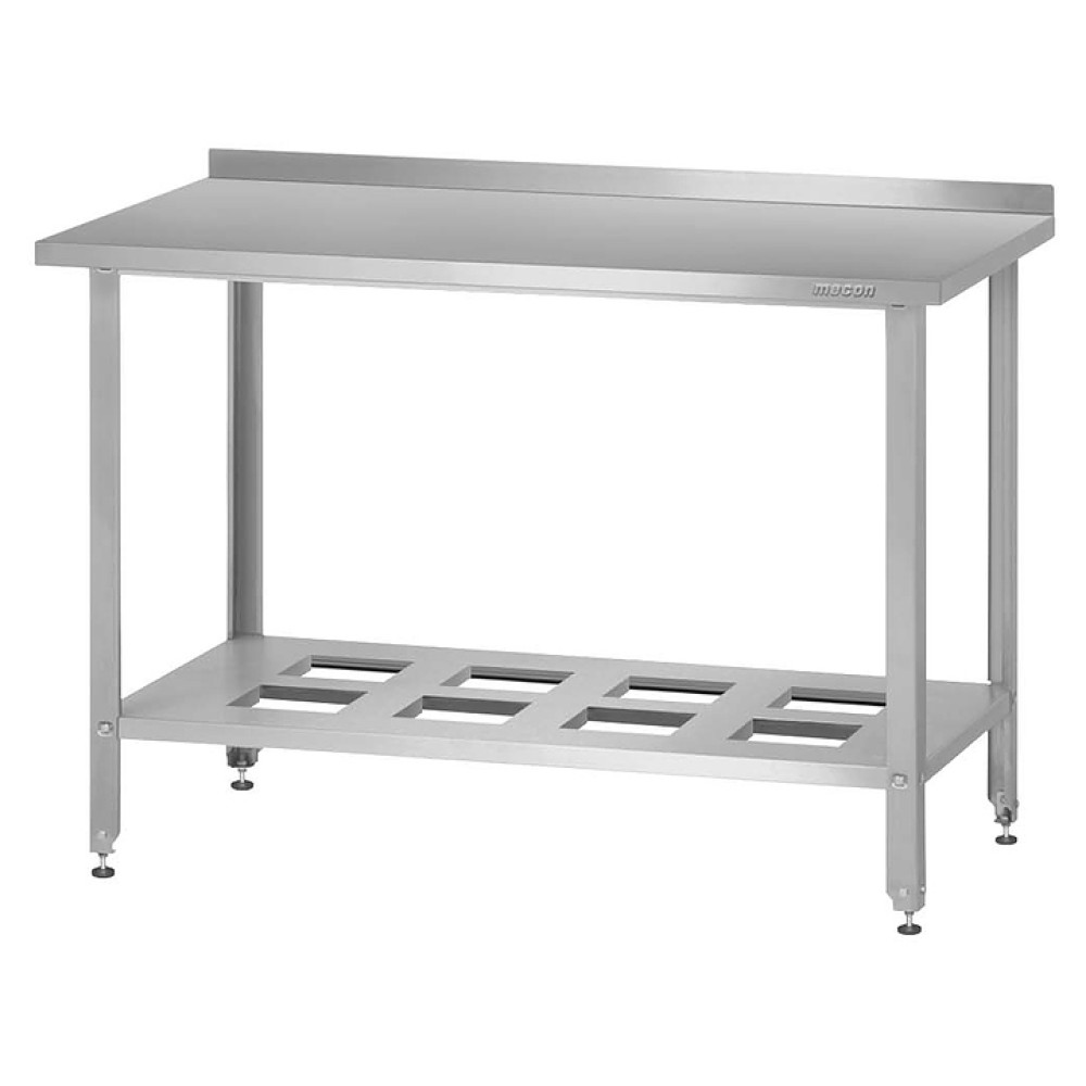 Производственный стол Mecon Norma Inox СПРн предназначен для разделывания и обработки пищевых продуктов, а также в качестве вспомогательной поверхности для кухонного оборудования на предприятиях пищевой промышленности, общественного питания и торговли. Модель оснащена усиленной полкой-решеткой и регулируемыми по высоте полиамидными опорами со стальными подпятниками. Каркас выполнен из уголка нержавеющей стали с подгибами и базирующими пуклевками, столешница - из шлифованной пищевой нержавеющей стали AISI 430 с усилением подложкой из ЛДСП, полка - из нержавеющей стали.