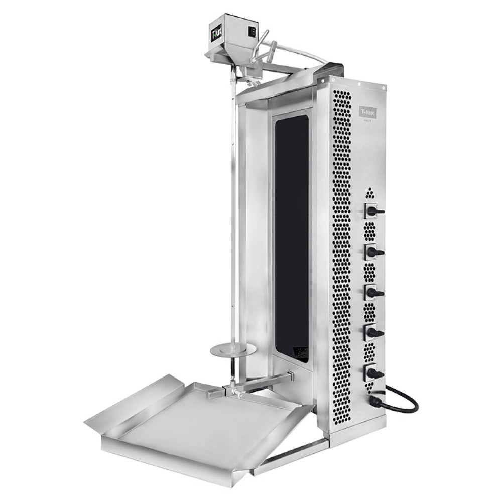 Гриль для шаурмы T-LUX SMU-5 используется на предприятиях общественного питания и торговли для обжарки большого количества различных видов мяса и птицы для приготовления начинки из рубленного мяса для шаурмы и других блюд. Модель оснащена ТЭНами с керамическим термостойким защитным стеклом Robax, предотвращающим попадание масла на них. Корпус выполнен из нержавеющей стали AISI 304.