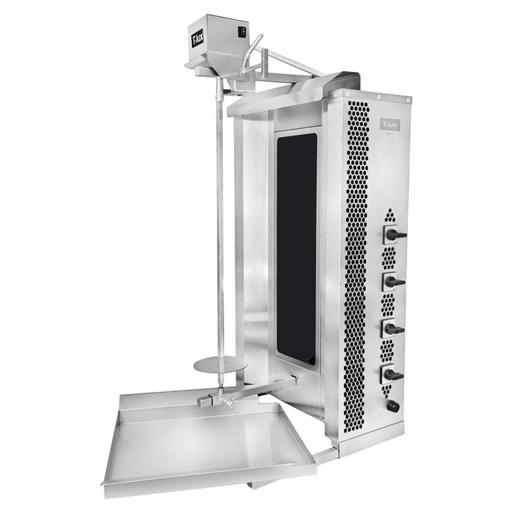 Гриль для шаурмы T-LUX SMU-4 используется на предприятиях общественного питания и торговли для обжарки большого количества различных видов мяса и птицы для приготовления начинки из рубленного мяса для шаурмы и других блюд. Модель оснащена ТЭНами с керамическим термостойким защитным стеклом Robax, предотвращающим попадание масла на них. Корпус выполнен из нержавеющей стали AISI 304.