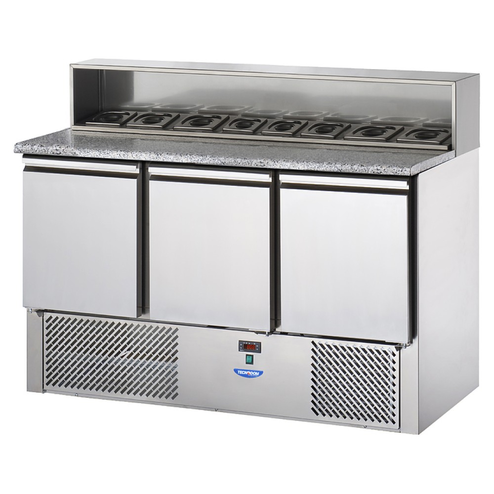 Стол для салатов Tecnodom SLV03AI используется на предприятиях общественного питания и торговли для обработки ингредиентов, используемых для приготовления пиццы, салатов и других блюд, а также для охлаждения и кратковременного хранения скоропортящихся продуктов и напитков. Модель оснащена электронной панелью управления с NTC датчиком и надстройкой над столешницей, вмещающей гастроемкости. Корпус, за исключением агрегатного отсека, и надстройка выполнены из нержавеющей стали, столешница - из гранита, теплоизоляция - полиуретан, впрыскиваемый под высоким давлением.