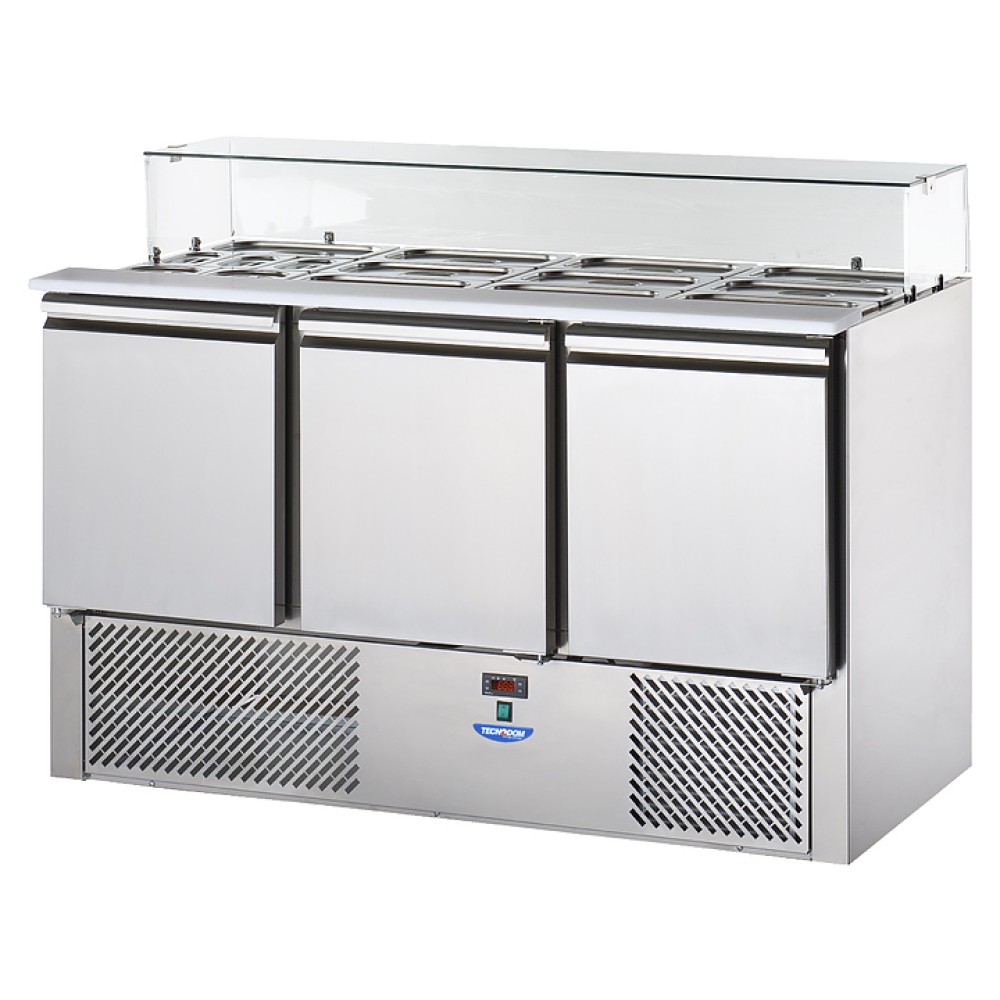 Стол для салатов Tecnodom SLV03VD используется на предприятиях общественного питания и торговли для обработки ингредиентов, используемых для приготовления пиццы, салатов и других блюд, а также для охлаждения и кратковременного хранения скоропортящихся продуктов и напитков. Модель оснащена электронной панелью управления с NTC датчиком, защитным экраном из закаленного стекла и бортом из полиэтилена. Корпус, за исключением агрегатного отсека, выполнен из нержавеющей стали, теплоизоляция - полиуретан, впрыскиваемый под высоким давлением.