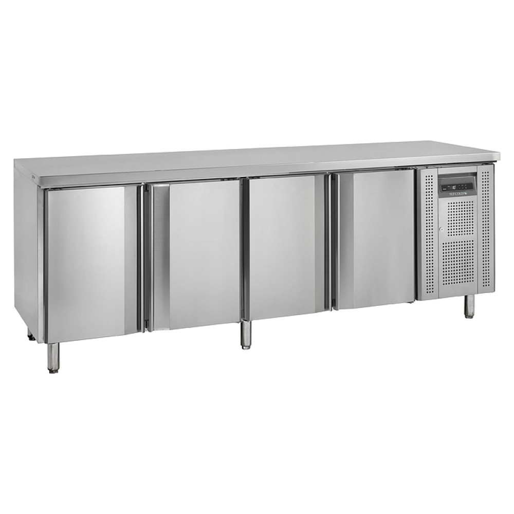 Холодильный стол TEFCOLD CK7410-SP используется на предприятиях общественного питания и торговли для раскатки теста и обработки ингредиентов для приготовления блюд, охлаждения и кратковременного хранения продуктов. Прибор оснащен съемной столешницей без борта, 4 распашными самозакрывающимися дверьми, 4 решетчатыми белыми полками GN1/1, термометром и 6 регулируемыми ножками. Корпус и внутренняя отделка выполнены из нержавеющей стали SS304.