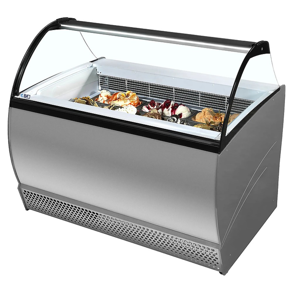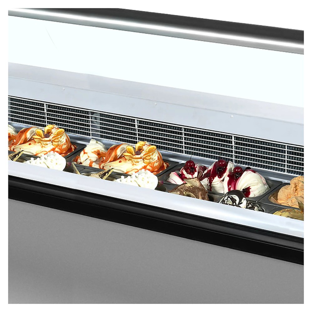 Напольная морозильная витрина TEFCOLD ISABELLA 10LX предназначена для эффектной демонстрации и кратковременного предпродажного хранения порционных мороженого, сорбетов и других холодных десертов в гастроемкостях на предприятиях общественного питания и торговли. Модель оснащена подставкой с встроенным компрессорным агрегатом, наклонной экспозиционной поверхностью и обзорным остеклением с плавно нисходящим выпуклым фронтом. Внутренняя облицовка выполнена из окрашенной в белый цвет пластифицированной стали, экстерьер корпуса серого цвета, остекление – из прозрачного закаленного стекла, теплоизоляция – из пенополиуретана.