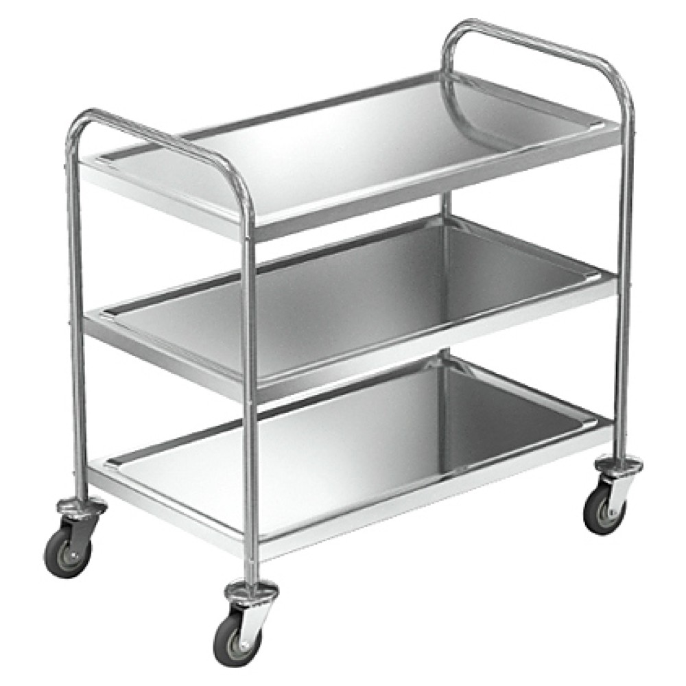 Сервировочная тележка Техно-ТТ ТПР-330/805 предназначена для доставки готовых блюд, сбора тарелок, чашек и стаканов со столов на предприятиях общественного питания и торговли. Модель оснащена 3 полками и 4 колесами, 2 из которых с тормозными устройствами. Разборный каркас выполнен из круглой трубы из нержавеющей стали AISI 201, полки - из нержавеющей стали AISI 430.