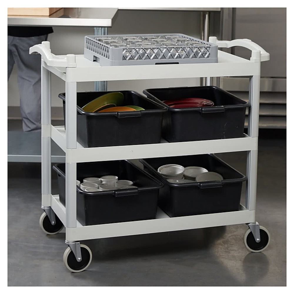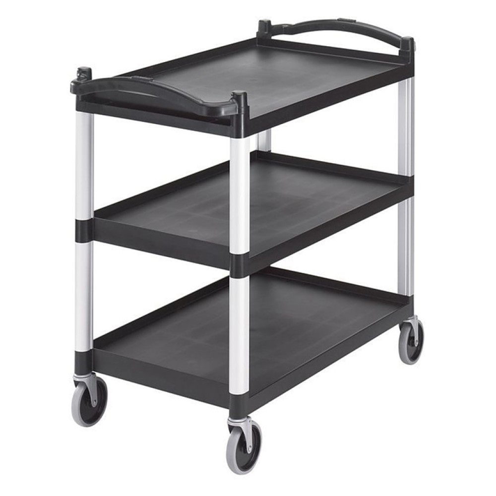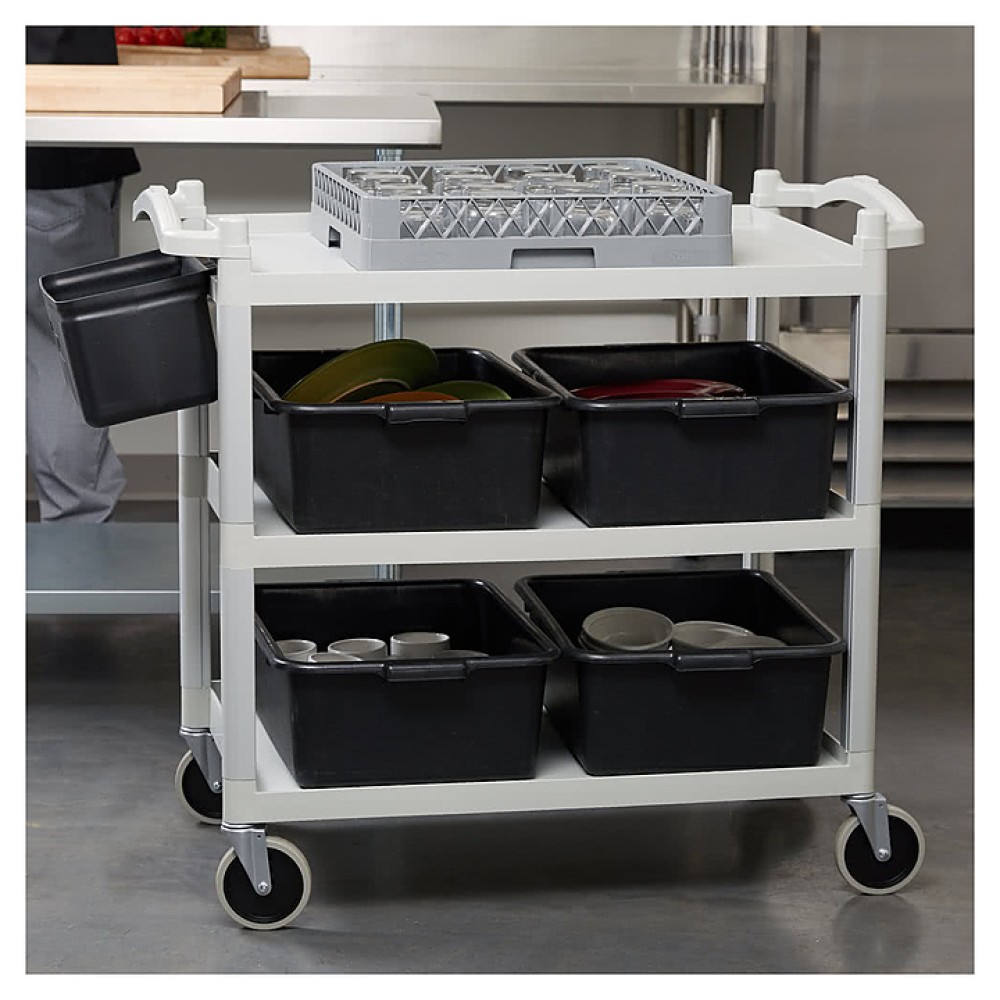 Тележка для обслуживания Cambro BC340KD 110 предназначена для транспортировки посуды, инвентаря, продуктов, пищевых отходов и предметов сервировки на предприятиях общественного питания, в медицинских учреждениях, санаториях и отелях. Изделие значительно облегчает и ускоряет процесс перемещения. Корпус выполнен из алюминия, полки - из полипропилена.