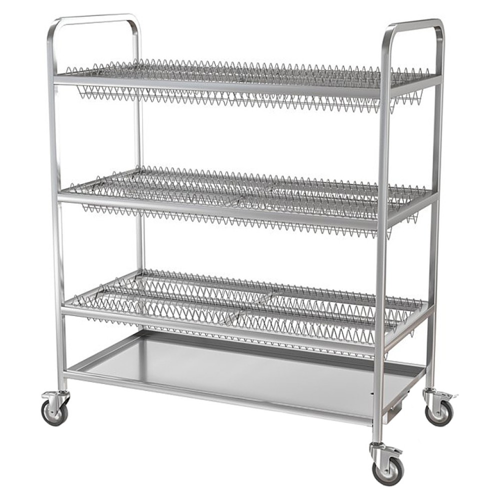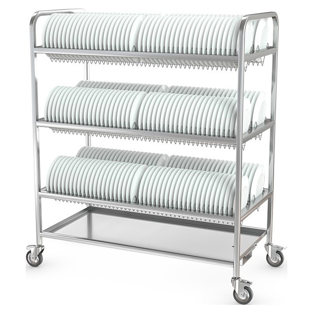 Тележка ATESY ТТ-Л-3-1200.600-02 серии Люкс используется на предприятиях общественного питания и торговли для временного хранения, транспортировки и естественной сушки тарелок, блюдец и другой посуды. Модель оснащена съемными кассетами для сушки тарелок. Полки и поддон выполнены из нержавеющей стали AISI 304, кассеты - из нержавеющего прутка AISI 304, рамы - из нержавеющей трубы AISI 304 сечением 25х25 мм.