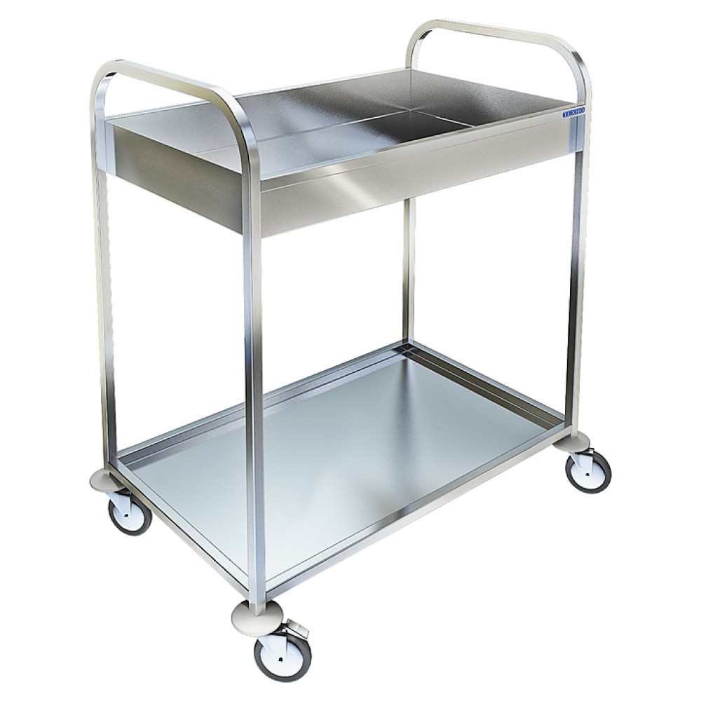 Комбинированная тележка Техно-ТТ ТП-221 предназначена для доставки готовых блюд, сбора тарелок, чашек и стаканов со столов на предприятиях общественного питания и торговли. Модель оснащена 2 полками и 4 колесами, 2 из которых с тормозными устройствами. Разборный каркас выполнен из квадратной трубы из нержавеющей стали AISI 304, полки - из нержавеющей стали AISI 304.