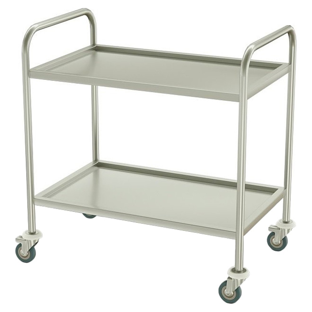 Сервировочная тележка ATESY ТС-С-2-800.500.850-02 серии Стандарт используется на предприятиях общественного питания для перемещения готовых блюд, напитков и посуды в зал приема пищи, а также для подачи грязной посуды из зала в моечное отделение. Модель оснащена 2 вместительными полками с бортиками. Полки выполнены из нержавеющей стали AISI 430, рамы - из нержавеющей трубы AISI 201 диаметром 25 мм.