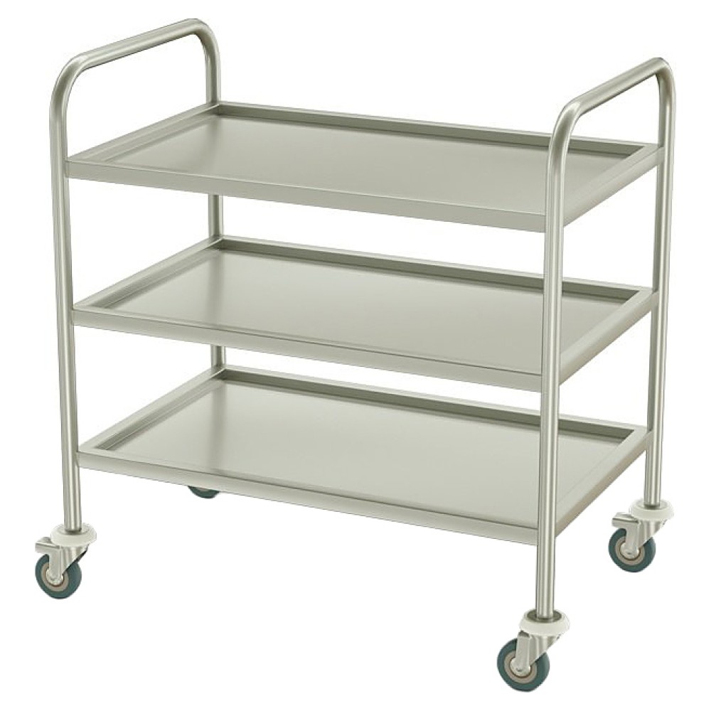 Сервировочная тележка ATESY ТС-С-3-850.530.900-02 серии Стандарт используется на предприятиях общественного питания для перемещения готовых блюд, напитков и посуды в зал приема пищи, а также для подачи грязной посуды из зала в моечное отделение. Модель оснащена 3 вместительными полками с бортиками. Полки выполнены из нержавеющей стали AISI 430, рамы - из нержавеющей трубы AISI 201 диаметром 25 мм.