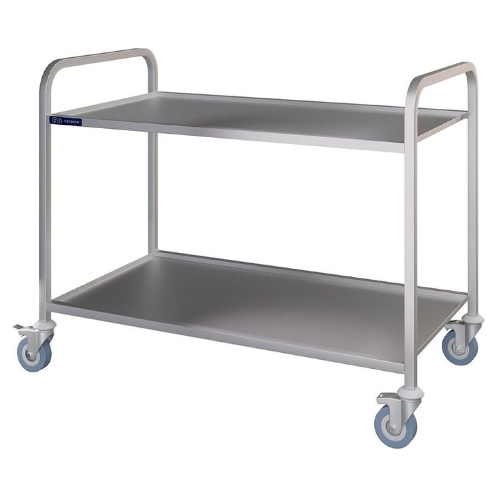 Сервировочная тележка KAYMAN ТС-13/2-11-85-А используется на предприятиях общественного питания для транспортировки готовых блюд, напитков и посуды в зал приема пищи, а также грязной посуды из зала в моечное отделение. Модель оснащена 2 сплошными полками с бортиками. Полки выполнены из листовой нержавеющей стали марки AISI 304, каркас – из профиля трубы квадратного сечения из нержавеющей стали марки AISI 304.