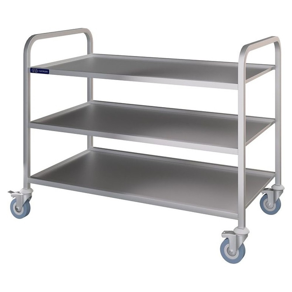 Сервировочная тележка KAYMAN ТС-13/3-11-85-А используется на предприятиях общественного питания для транспортировки готовых блюд, напитков и посуды в зал приема пищи, а также грязной посуды из зала в моечное отделение. Модель оснащена 3 сплошными полками с бортиками. Полки выполнены из листовой нержавеющей стали марки AISI 304, каркас – из профиля трубы квадратного сечения из нержавеющей стали марки AISI 304.