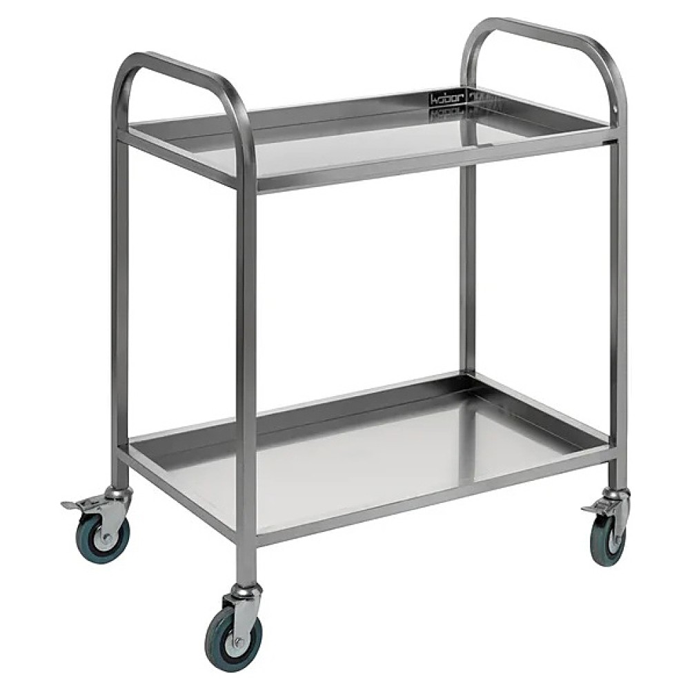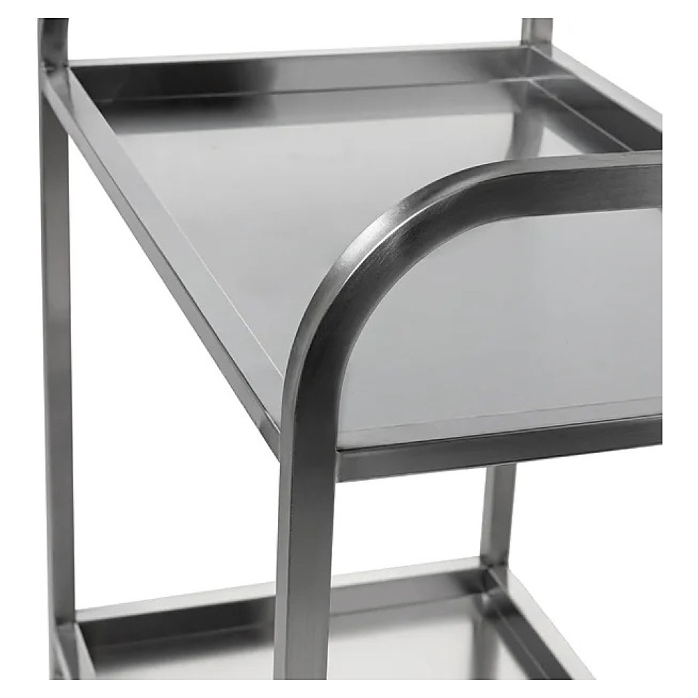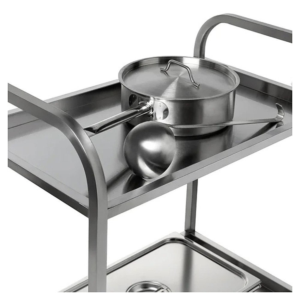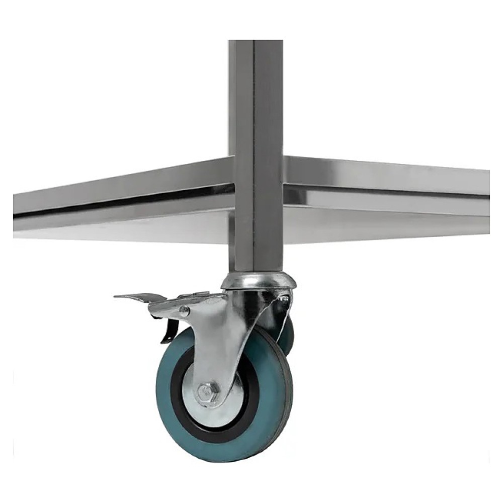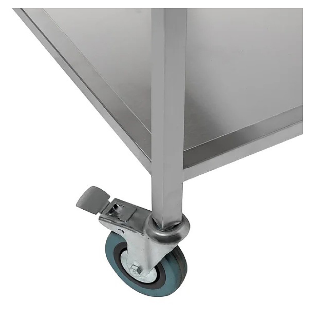 Тележка оснащена 2 полками глубиной 30 мм, изготовленных из нержавеющей стали, каркас произведен из нержавеющей квадратной трубы 25х25 мм. Перемещение тележки осуществляется за счет четырех поворотных колес диаметром 100 мм, два из которых имеют тормоз.