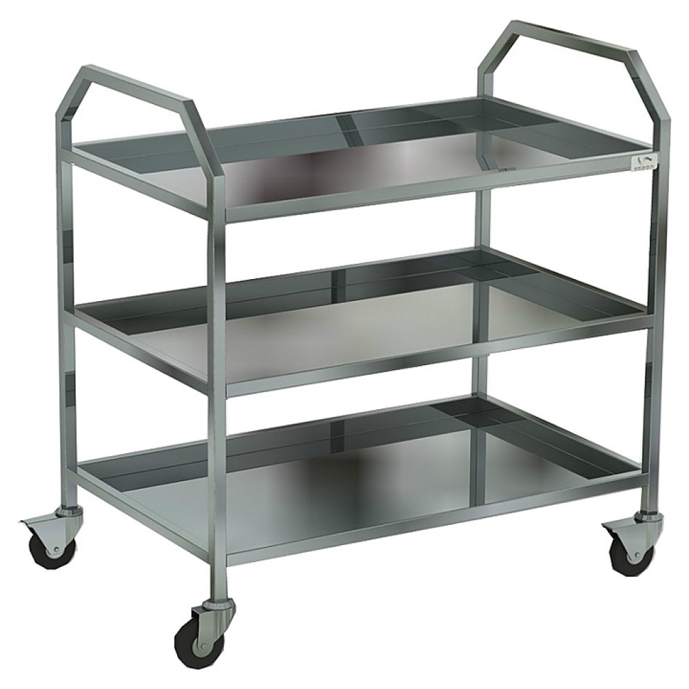 Тележка оснащена 3 полками глубиной 30 мм, изготовленных из нержавеющей стали, каркас произведен из нержавеющей квадратной трубы 25х25 мм. Перемещение тележки осуществляется за счет четырех поворотных колес диаметром 100 мм, два из которых имеют тормоз.