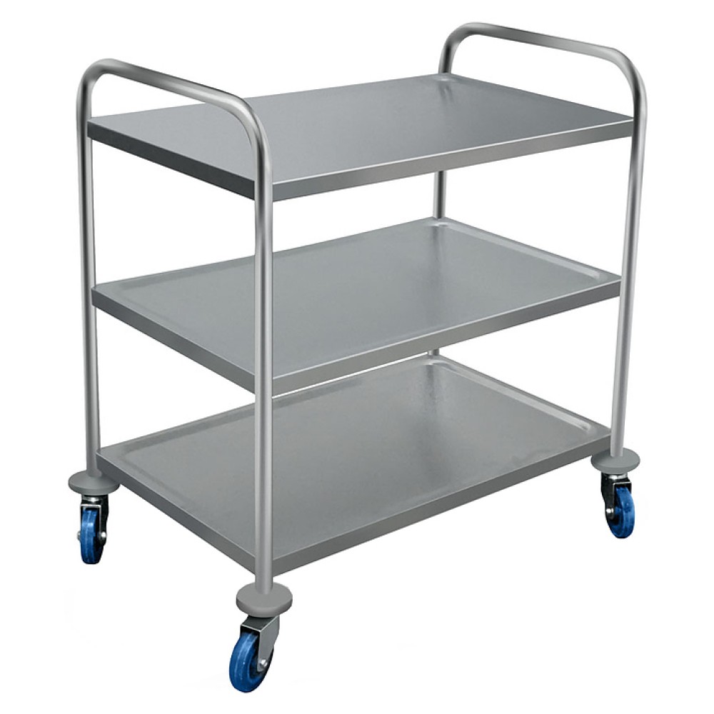 Сервировочная тележка Luxstahl A1005, TR-М3 используется на предприятиях общественного питания, в ресторанах и гостиницах для перемещения готовых блюд, напитков и посуды в зал приема пищи, а также для подачи грязной посуды из зала в моечное отделение. Модель оснащена 3 вместительными полками, 2 удобными верхними поручнями и колесиками. Каркас разборный. Изделие выполнено из нержавеющей стали.
