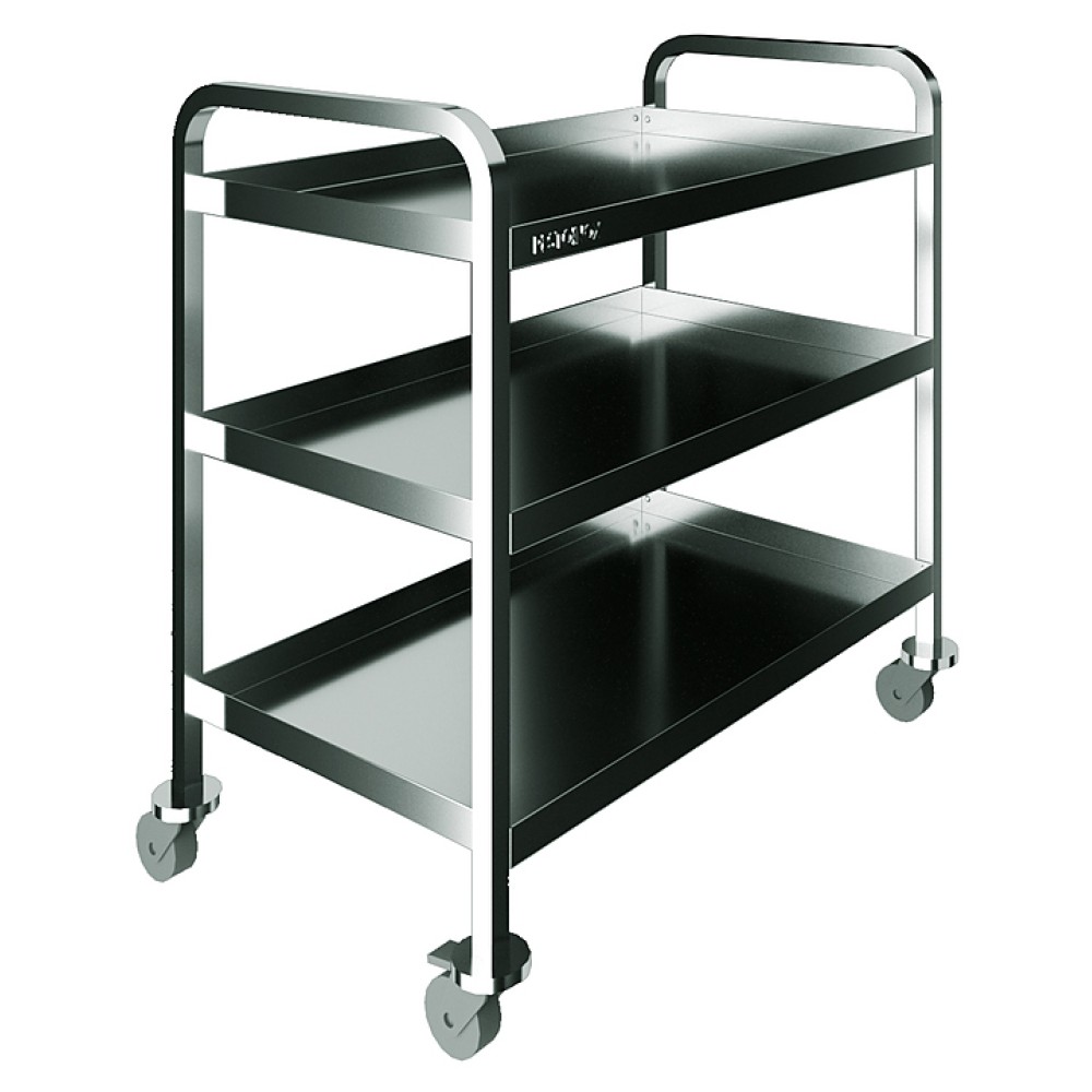 Сервировочная тележка Restoinox ТС-3-8/5 предназначена для транспортировки готовых блюд и посуды на предприятиях общественного питания. Модель оснащена 3 полками и 4 поворотными колесами, 2 из которых со стопорами. Каркас выполнен из трубы 25х25 мм нержавеющей стали AISI 430, полки - из нержавеющей стали AISI 430 мм.