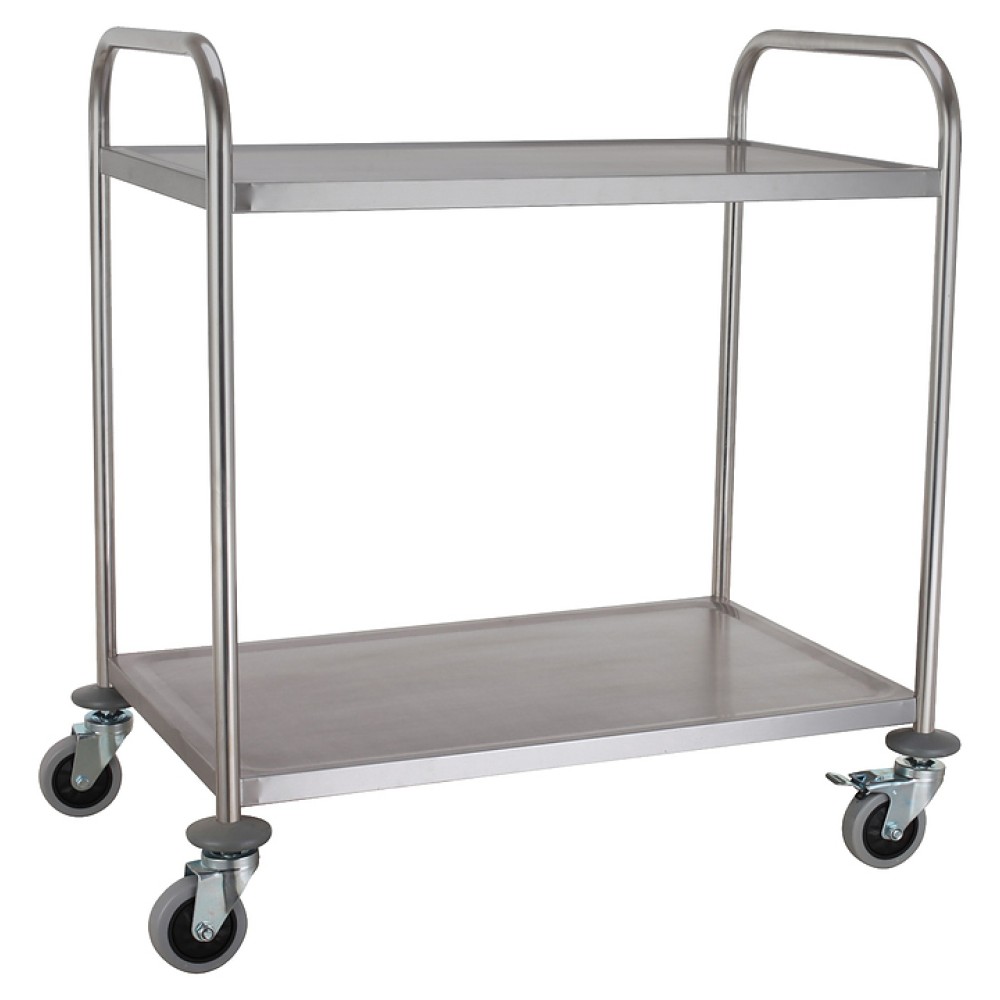 Тележка VIATTO RST2B используется на предприятиях общественного питания для перемещения готовых блюд, напитков и посуды в зал приема пищи, а также для подачи грязной посуды из зала в моечное отделение.. Модель оснащена 2 вместительными полками и 4 поворотными колесами, 2 из которых снабжены стопорами. Каркас выполнен из круглой трубы нержавеющей стали.