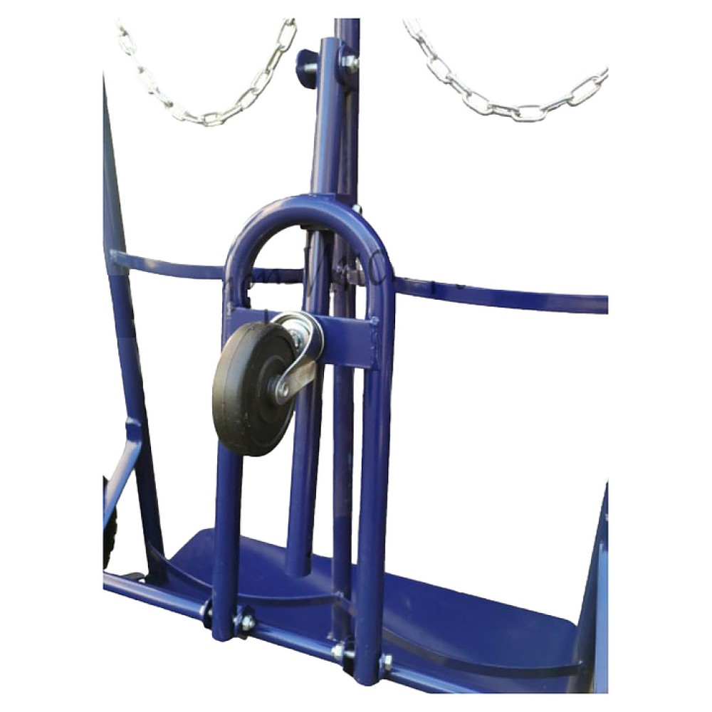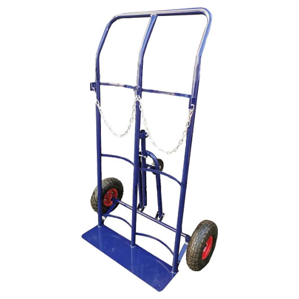 Тележка Мастер-инструмент HT1702 предназначена для единовременной транспортировки 2 газовых баллонов, а также других крупногабаритных и тяжелых грузов на складах, строительных и сельскохозяйственных объектах, предприятиях общественного питания, торговли и других отраслей. Модель оснащена 2 секциями со сплошной платформой, дугообразной ведущей рукояткой, 2 цепями для фиксации груза, 2 осевыми пневматическими колесами с не симметричной ступицей, а также откидной опорой с поворотным роликом. Вертикально ориентированная сварная рама выполнена из профиля металлической трубы круглого сечения с антикоррозийным покрытием краской синего цвета, цепи – из оцинкованной стали.