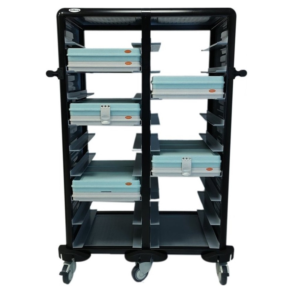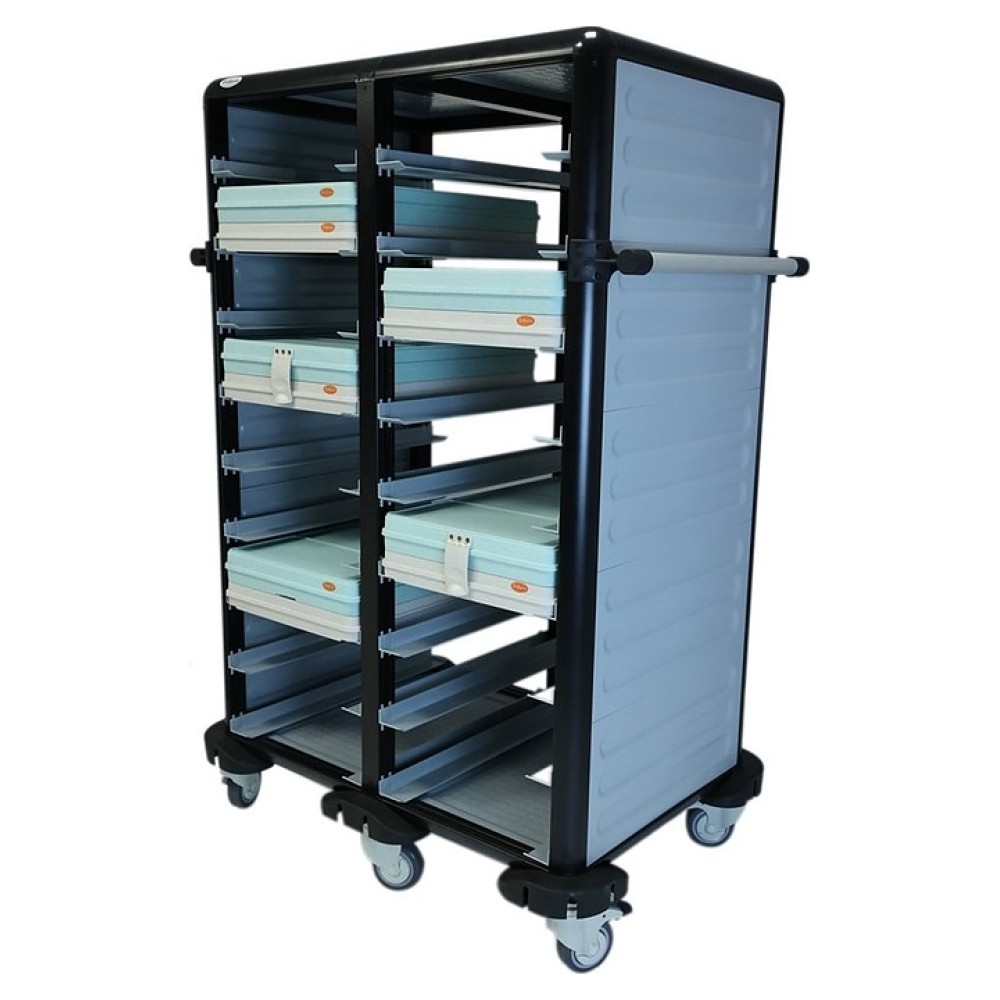 Тележка Tribeca 71х101х149 см предназначена для транспортировки термоподносов серии TT и аналогичных моделей на предприятиях общественного питания и торговли. Модель оснащена 2 отделениями по 9 ярусов направляющих в каждом, глухими боковыми, верхней и нижней панелями. Корпус выполнен из прочного пластика черного цвета.