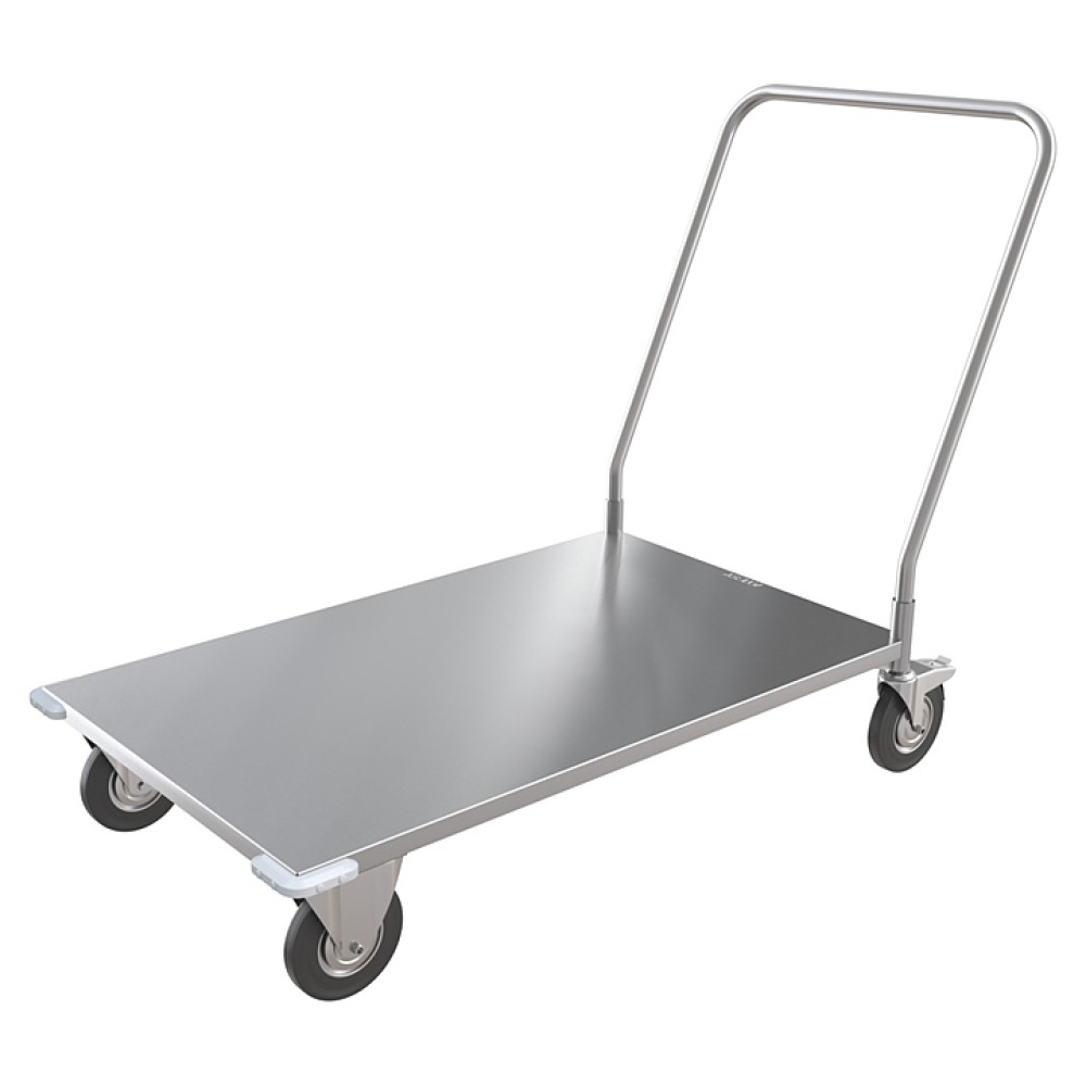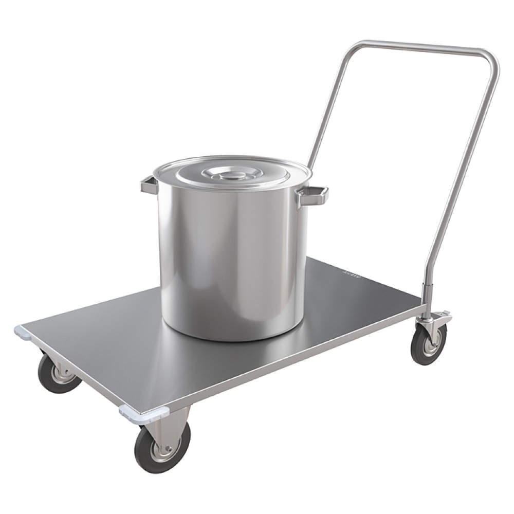 Грузовая тележка ATESY ТГР-1000.600-02 серии Стандарт используется на предприятиях общественного питания и торговли для перемещения различных грузов. Модель оснащена 4 колесами, 2 из которых являются поворотными и снабжены тормозными устройствами. Разборная конструкция полностью выполнена из нержавеющей стали AISI 430.