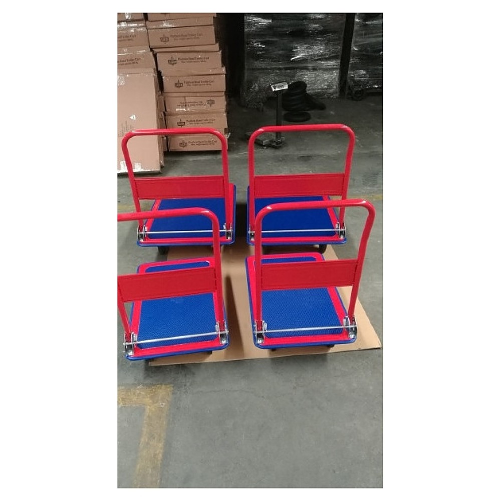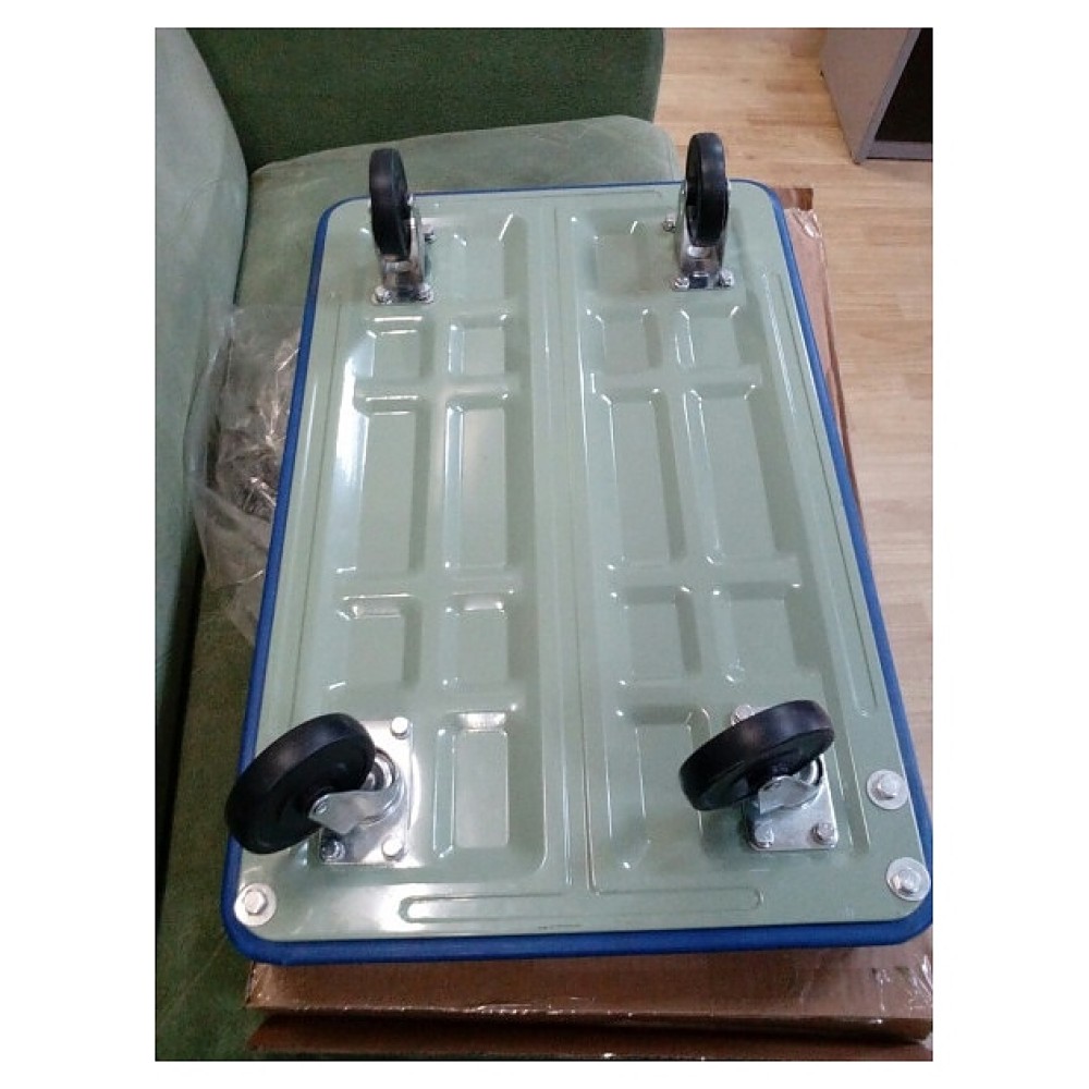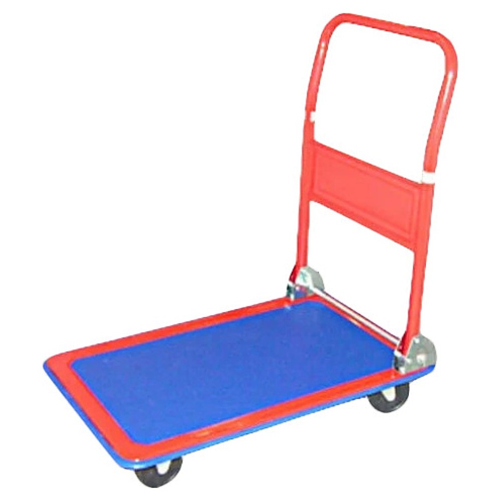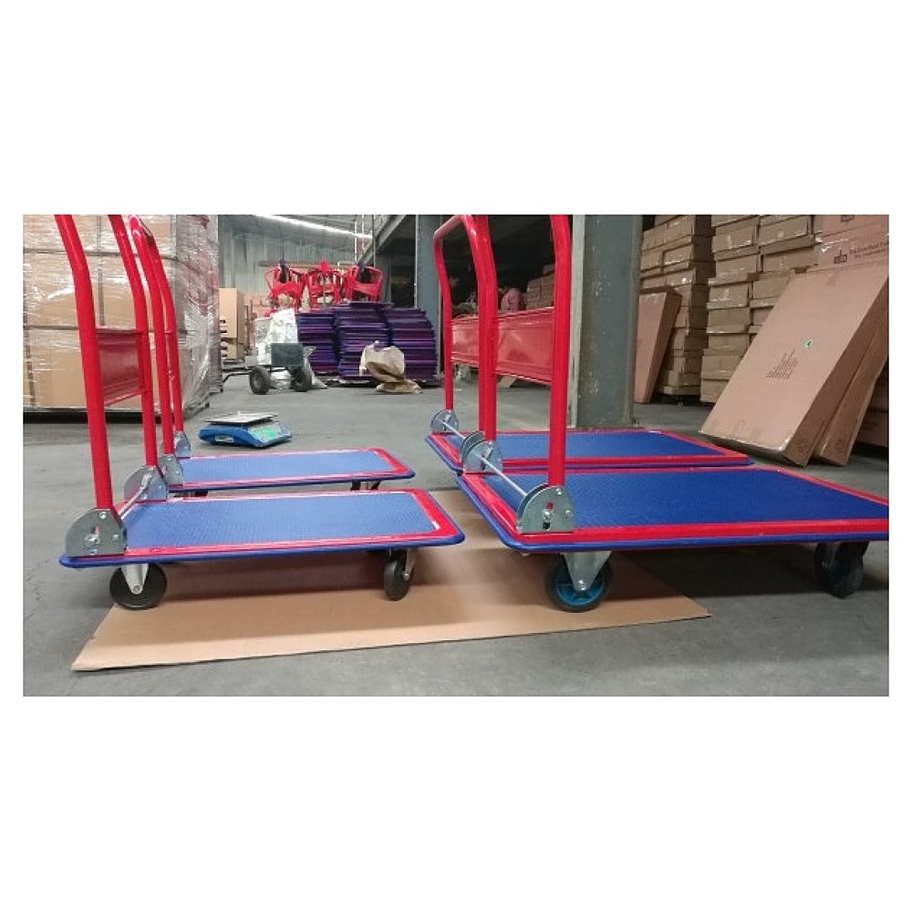 Производственная тележка Мастер-инструмент ТП 150 предназначена для транспортировки крупногабаритных и тяжелых грузов на складах, погрузочно-разгрузочных терминалах, строительных и сельскохозяйственных объектах, предприятиях общественного питания, торговли и других отраслей. Модель оснащена сплошной прямоугольной платформой, складной дугообразной ведущей рукояткой, 4 колесами, включая 2 поворотных. Рукоятка выполнена из профиля металлической трубы круглого сечения с антикоррозийным покрытием краской красного цвета, платформа – из металла с нескользящим синим ковриком на рабочей поверхности, колеса – из пластика с резиновыми шинами на металлических креплениях.