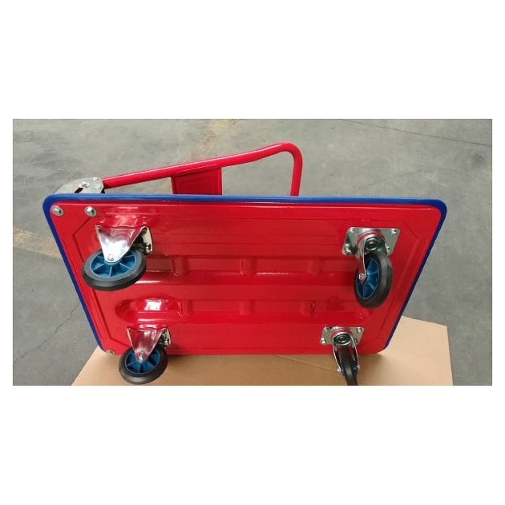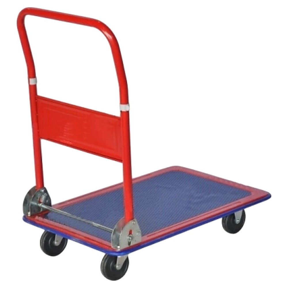Производственная тележка Мастер-инструмент ТП 300 предназначена для транспортировки крупногабаритных и тяжелых грузов на складах, погрузочно-разгрузочных терминалах, строительных и сельскохозяйственных объектах, предприятиях общественного питания, торговли и других отраслей. Модель оснащена сплошной прямоугольной платформой, складной дугообразной ведущей рукояткой, 4 колесами, включая 2 поворотных. Рукоятка выполнена из профиля металлической трубы круглого сечения с антикоррозийным покрытием краской красного цвета, платформа – из металла с нескользящим синим ковриком на рабочей поверхности, колеса – из пластика с резиновыми шинами на металлических креплениях.