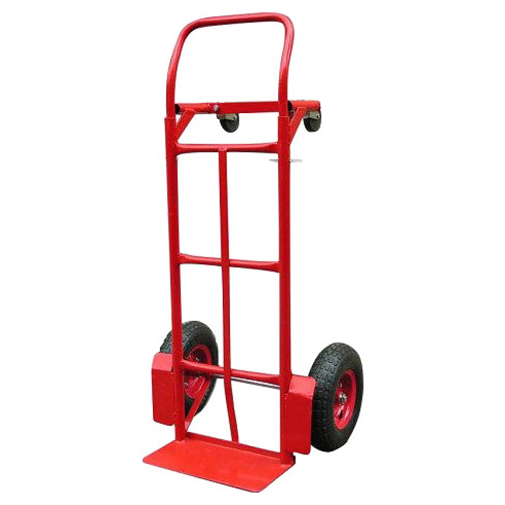 Производственная тележка-трансформер Мастер-инструмент HT 2009 предназначена для транспортировки крупногабаритных и тяжелых грузов на складах, строительных и сельскохозяйственных объектах, предприятиях общественного питания, торговли и других отраслей. Модель оснащена сплошной платформой, решетчатой спинкой, складной дугообразной ведущей рукояткой, 2 осевыми пневматическими колесами с не симметричной ступицей и 2 поворотными роликами для возможности перемещения как в горизонтальном так и в вертикальном положении. Сварная рама выполнена из профиля металлической трубы круглого сечения с антикоррозийным покрытием краской красного цвета.