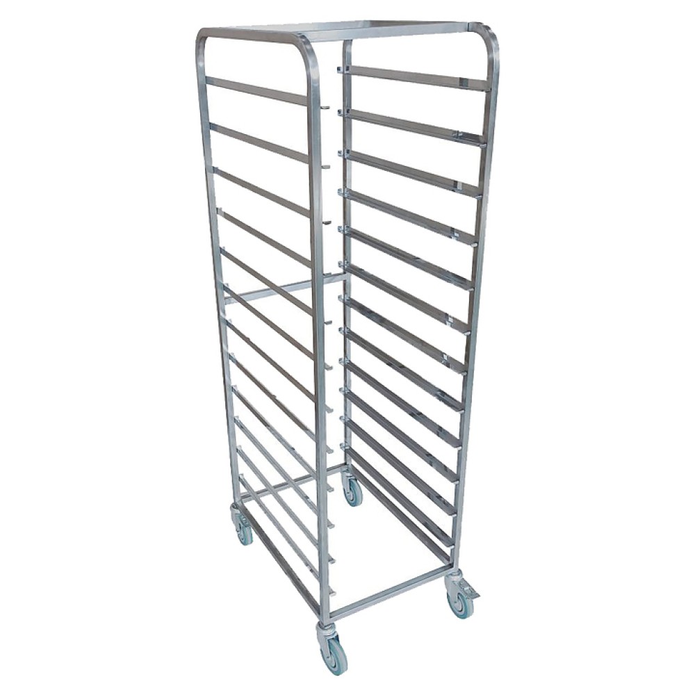 Тележка-шпилька KRONER КШ16/У используется на предприятиях общественного питания и торговли для временного хранения и транспортировки полуфабрикатов и готовой продукции на противнях. Модель оснащена сварным каркасом из квадратной профильной трубы, загрузкой противня узкой стороной, ограничителями и 4 поворотными колёсами, 2 из которых оборудованы тормозами. Изделие выполнено из нержавеющей стали AISI 430.