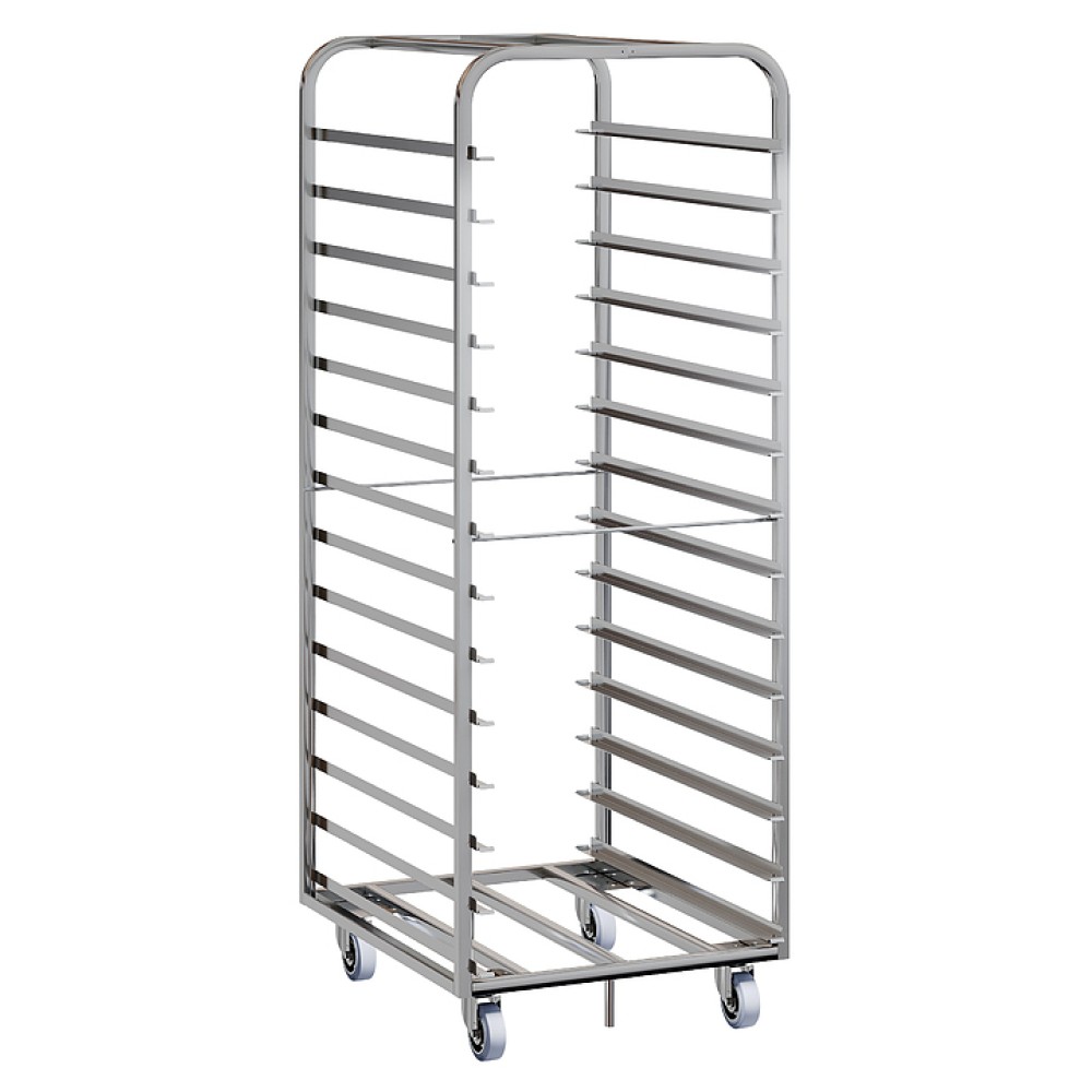 Тележка-шпилька Restoinox для ротационной печи BONGARD 8.64. применяется в качестве межоперационного транспортного средства при выпечке хлебобулочных изделий на предприятиях общественного питания и торговли. Модель оснащена 4 поворотными колесами. Сварной каркас выполнен из квадратной трубы 25х25 мм нержавеющей стали Aisi 430, направляющие - из нержавеющей стали Аisi 430, колеса - из термостойкой фенольной смолы.