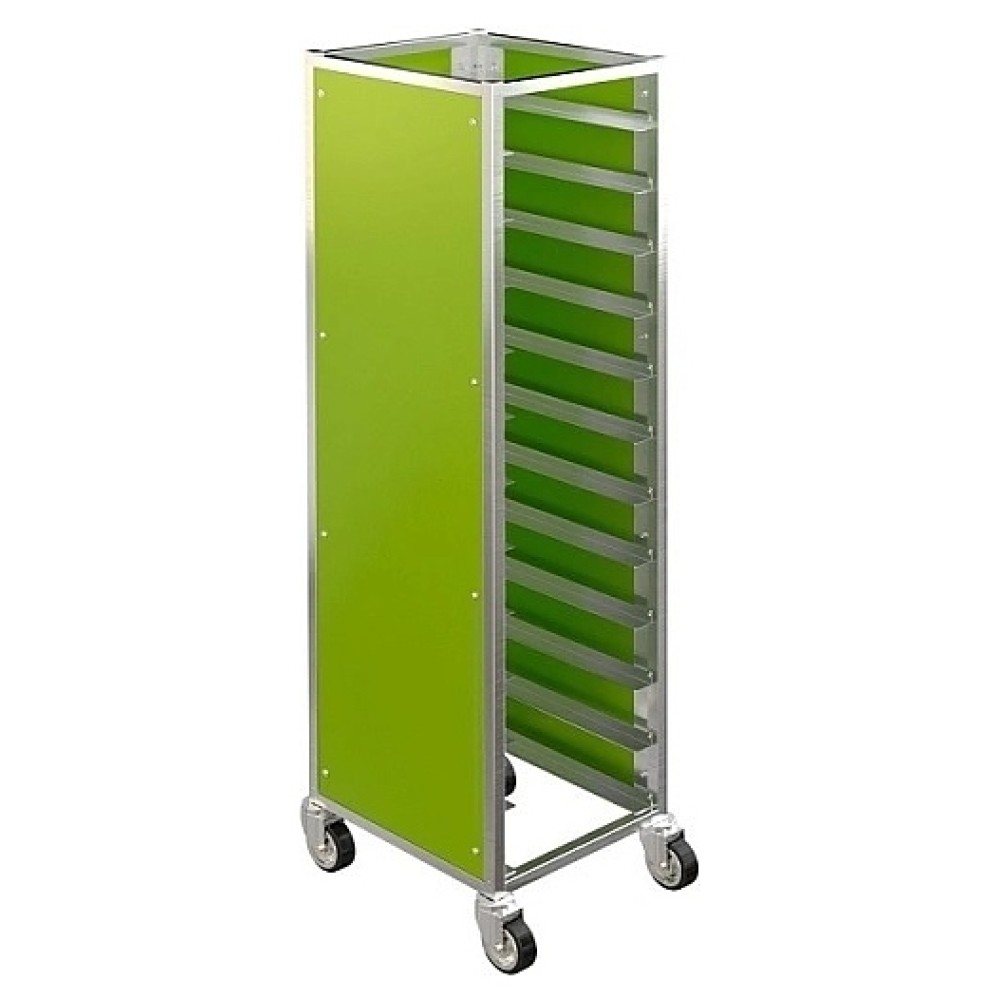 Тележка-шпилька Restoinox ТШCЗПП-12-25/25-430/325-360 предназначена для временного хранения и транспортировки подносов на предприятиях пищевой помышленности, общественного питания и торговли. Модель оснащена 12 уровнями широких направляющих, закрыта боковыми и задней стенкой. Каркас выполнен из профиля трубы квадратного сечения из нержавеющей стали марки AISI 430, направляющие – из нержавеющей стали марки AISI 430, стенки – из цветного листового пластика.