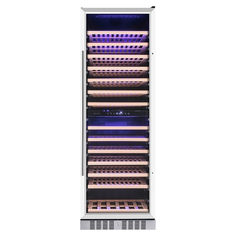 Винный шкаф Temptech Premium WP180DCS предназначен для охлаждения, хранения при оптимальных условиях и демонстрации бутилированного вина различных сортов в барах, ресторанах, специализированных магазинах, подсобных складских помещениях, а также домашних условиях. Модель оснащена холодильной камерой с 2 независимыми температурными зонами, 14 выдвижными полками, фронтальной цокольной решеткой, распашной дверью на перенавешиваемых петлях с длинной вертикальной рукояткой и прозрачным обзорным остеклением. Корпус выполнен из металла с антикоррозийным покрытием черного цвета, дверная рама – из нержавеющей стали, полки – из массива буковой древесины.