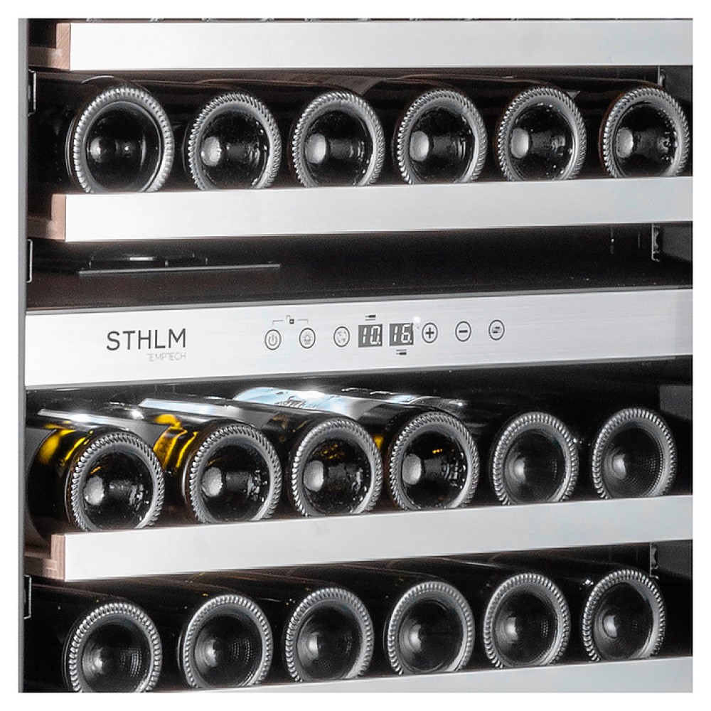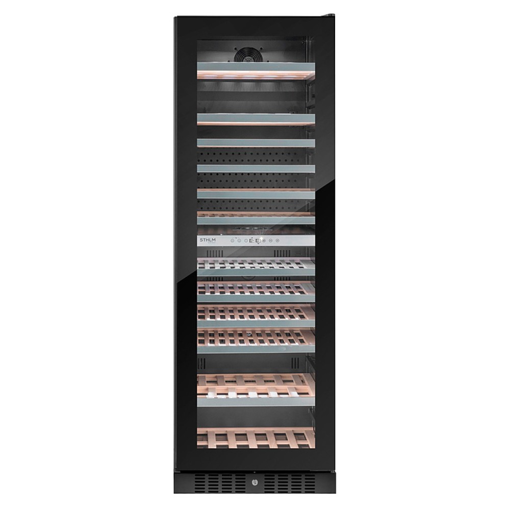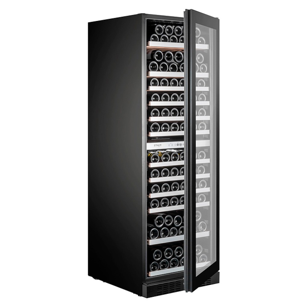 Винный шкаф Temptech STHLM ST180DRB предназначен для охлаждения, хранения и демонстрации бутилированного вина в отелях, винных магазинах, на предприятиях общественного питания и торговли. Модель оснащена сенсорной панелью с дисплеем для регулировки температуры и освещения, 12 выдвижными полками, дверцей с замком и встроенной ручкой, фильтром с активированным углем и белой светодиодной подсветкой. Дверца выполнена из трехслойного стекла с защитой от УФ-лучей, передняя панель - из черного стекла, полки - из необработанного бука с деталями из нержавеющей стали.